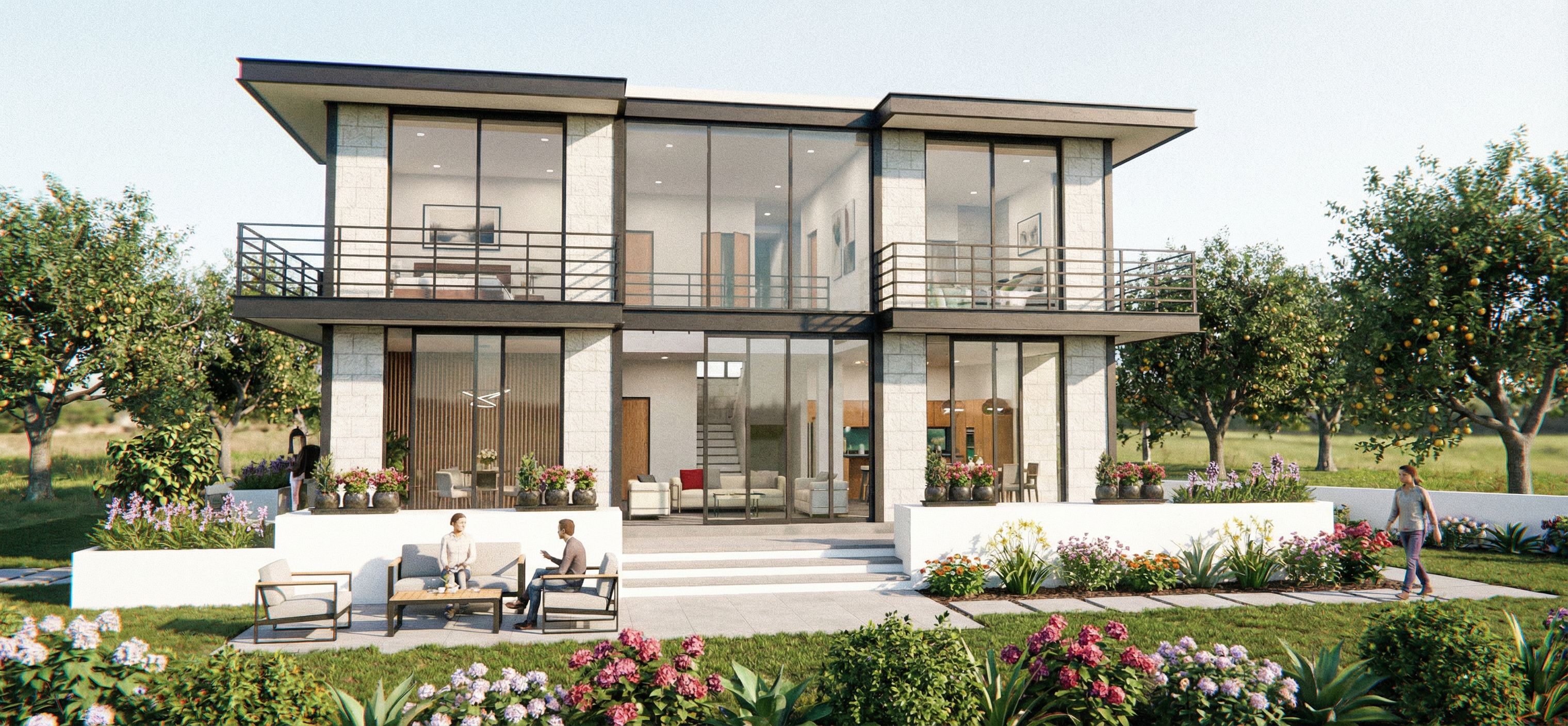 Fotografía de un edificio residencial contemporáneo con amplias paredes de cristal y una fachada minimalista de ladrillo blanco de estilo industrial. En la planta baja, a la izquierda, se encuentra el ingreso y hay unas sillas y mesa de centro , la zona central esta la sala de doble altura, y a la derecha están la barra de la cocina y el comedor. En la planta superior, a la derecha hay un dormitorio y a la izquierda otro dormitorio. Destaca las líneas elegantes, las texturas de la piedra natural y la vegetación integrada con macetas llenas de flores vibrantes. Situado en un entorno rural, sin otros edificios cercanos, el edificio cuenta con árboles frutales al fondo y una zona ajardinada al frente. se respeta la foto original y la foto de referencia los acabados exteriores , no lleva acabados en piedra en muros