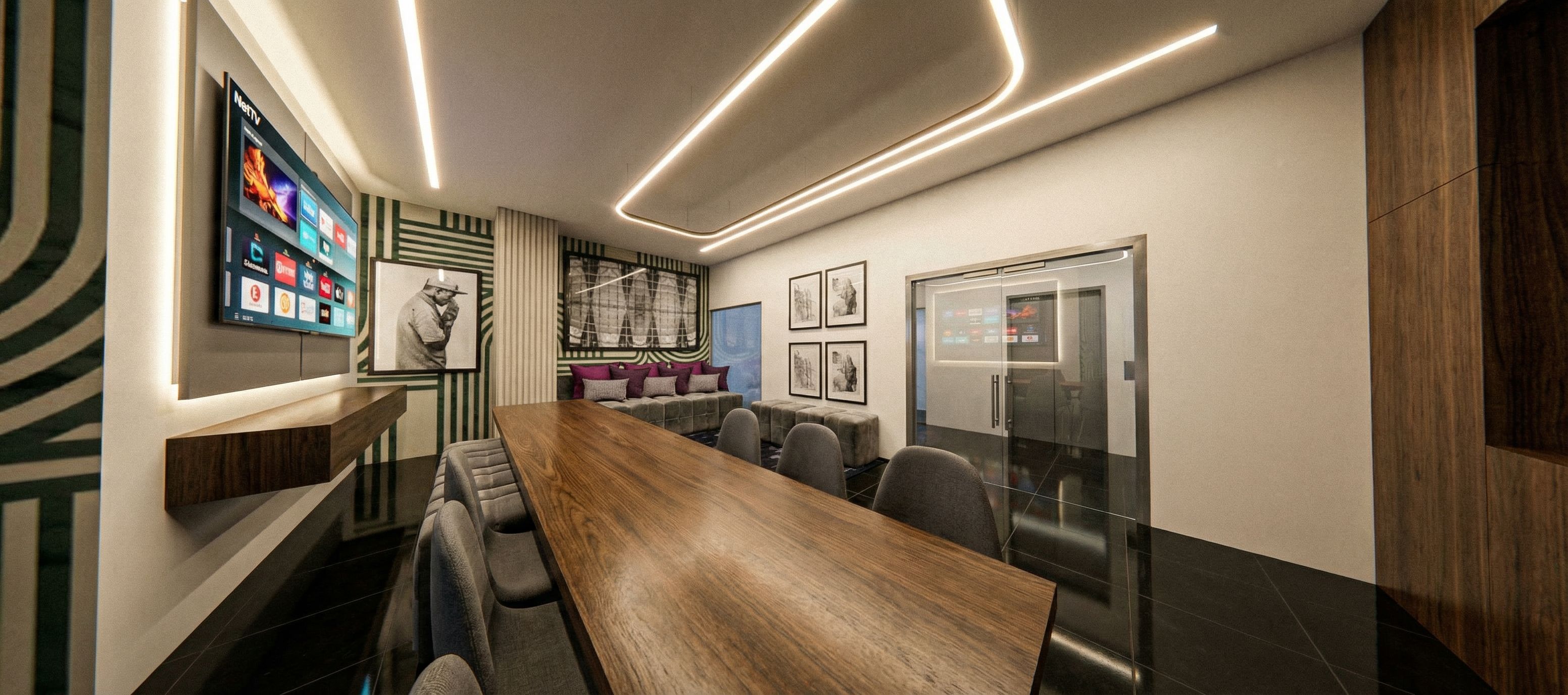 a photorealistic render of an recreational room, black tiled floor, rich materials, clean line, linear light in the ceiling with grroves, wall art, keep exact camera angle., keep exact camera angle