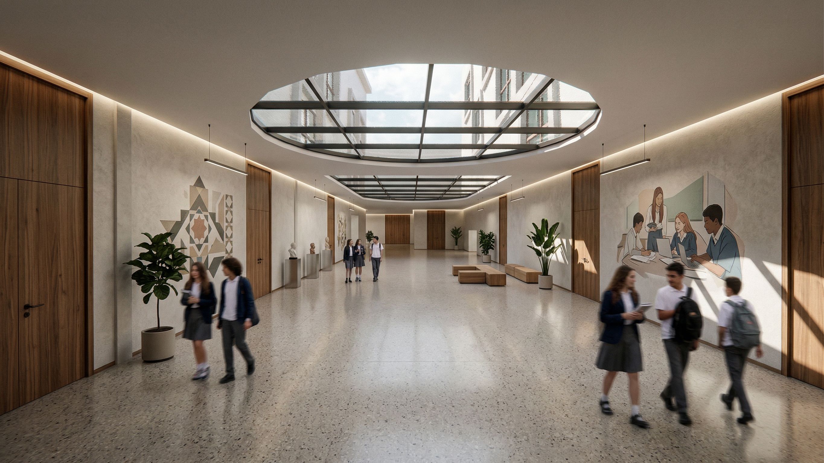 PromptPhoto of an expansive modern interior space of a Syrian high school corridor designed for versatility, featuring high ceilings and an overhead skylight that bathes the area in natural light. add murals on the walls . The environment conveys a minimalist aesthetic, with unique shadows cast by the skylight. Captured from a low-angle perspective to emphasize the spaciousness and architectural detail, lens specifications highlight clarity and depth, creating a sophisticated atmosphere that draws the viewer into the space.