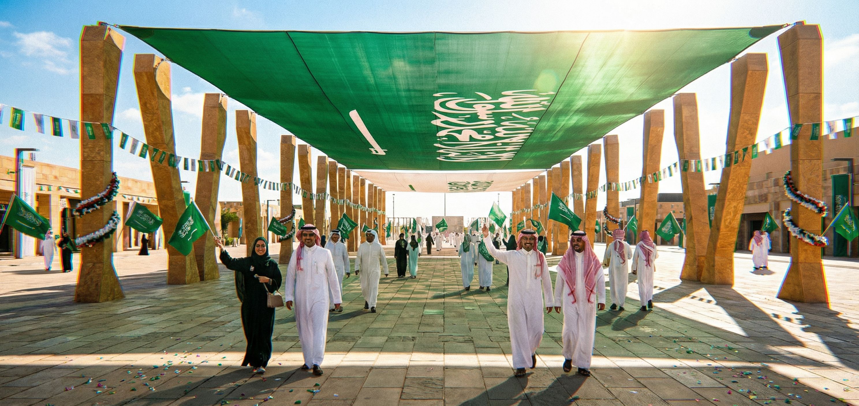 PromptWALK WAY ON plaza in Roshn sedra district , Riyadh stone , BLACK IS SAUDI FLAG , Saudi national day celebrations, keep exact camera angle