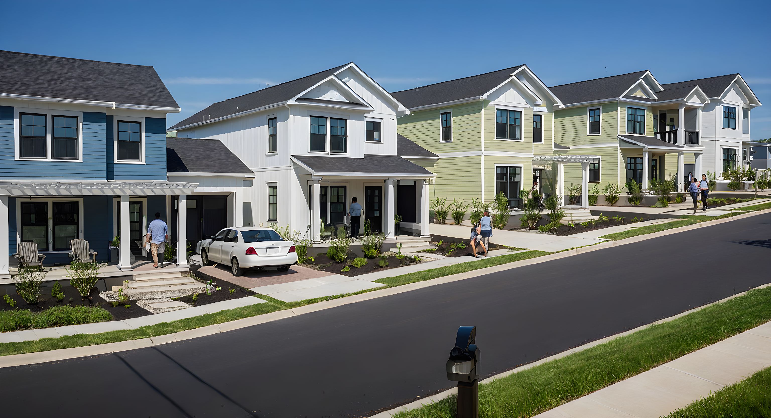 PromptPhoto of modern residential homes, featuring inviting porch details and vibrant landscaping. The buildings display a mix of white, light green and blue lap siding, complemented by dark roofs and white accents. Urban setting with well-maintained sidewalks and a community atmosphere, populated by residents interacting. Soft afternoon sunlight casts warm shadows, highlighting architectural features. Perspective from street level with a slightly angled view, using a wide-angle lens to capture the depth and neighborhood charm in a visually engaging manner.