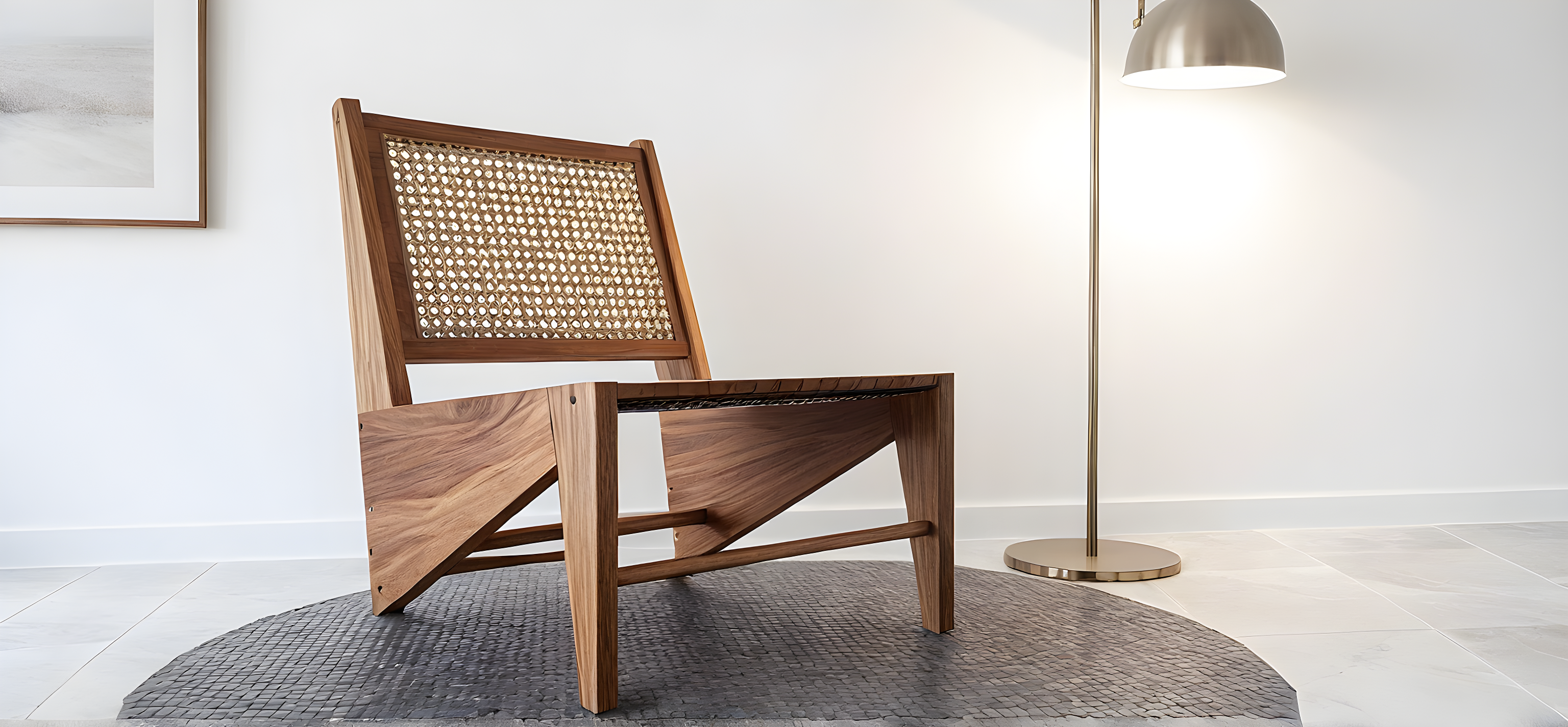 PromptSketch drawing of a chair made of light nogal wood. Against a white wall and tile flooring. Please keep the render as close to the drawing as possible. Do not make changes to the design of the chair.