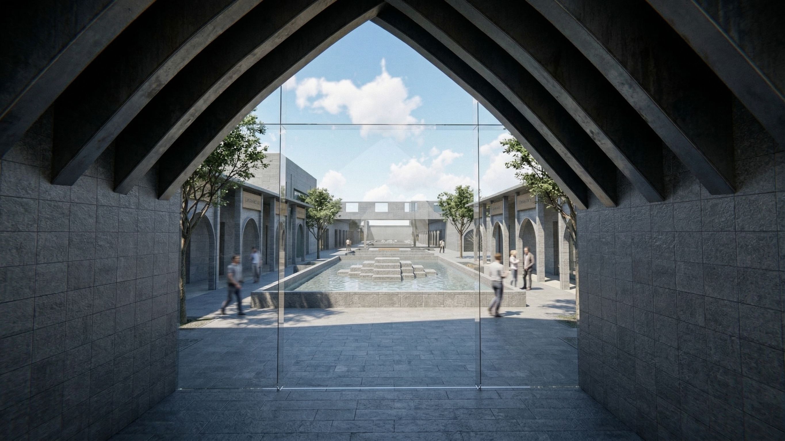 PromptUltra-realistic architectural render of the provided commercial marketplace design, preserving the exact geometry and layout without any modifications.