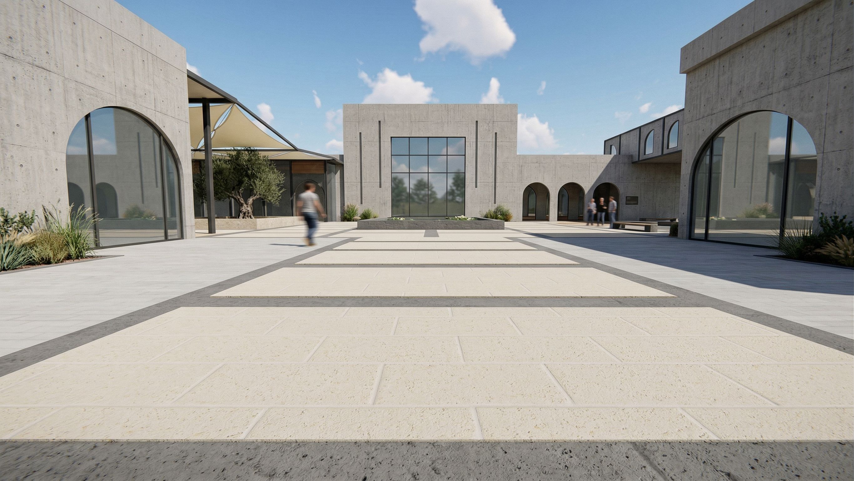 Apply realistic materials: clean modern glass facades with subtle reflections and natural stone cladding with fine texture detail.