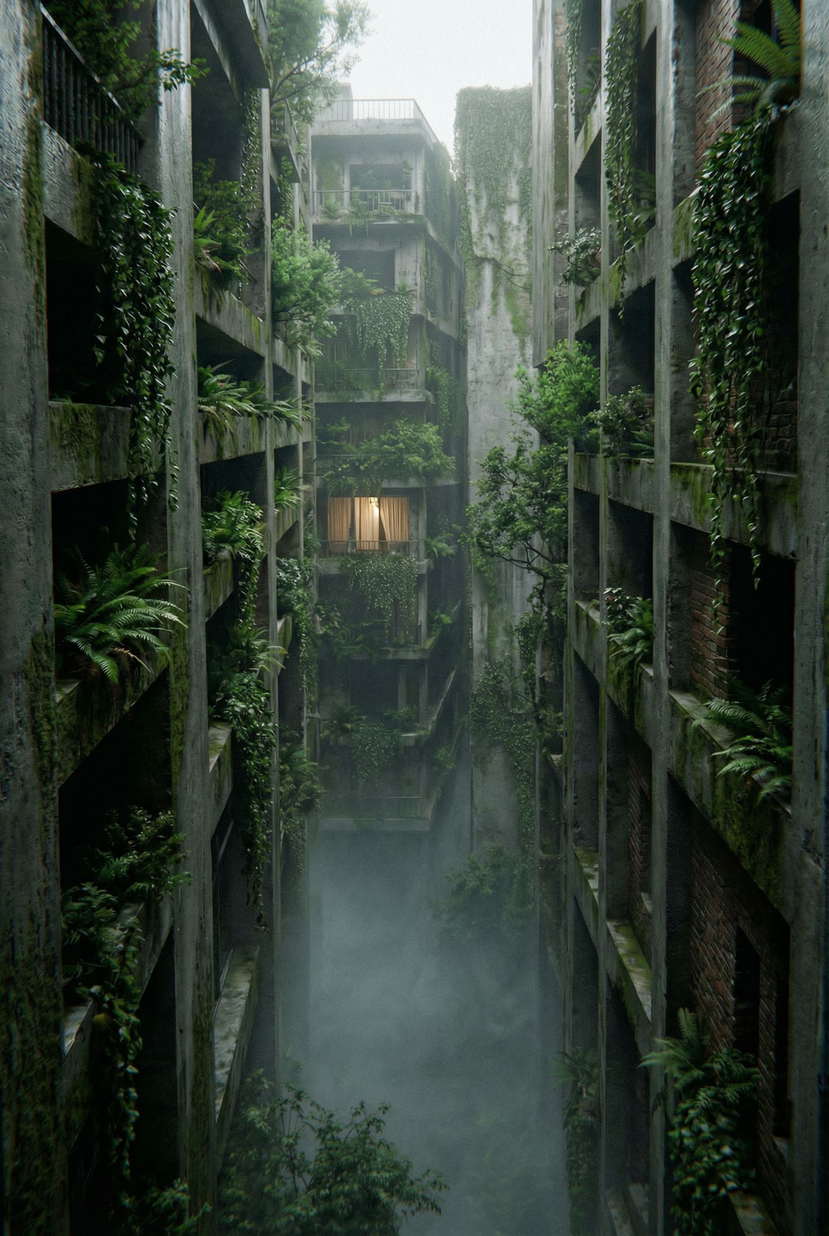transforma la imagen en líneas a una imgen 3d fotorealista con la siguiente descripción: La imagen muestra un estrecho callejón entre edificios altos y deteriorados, donde la naturaleza ha recuperado el espacio urbano. Las fachadas de hormigón llegan hasta el cielo y están cubiertas por vegetación exuberante: enredaderas, plantas colgantes y arbustos que brotan desde balcones y ventanas abandonadas. Una niebla muy densa se acumula en la parte baja del pasaje, creando una atmósfera misteriosa y silenciosa. La escena combina decadencia arquitectónica y vitalidad orgánica, sugiriendo un entorno postapocalíptico en el que la vida vegetal domina. La luz tenue resalta texturas húmedas y sombras profundas, reforzando la sensación de aislamiento y transformación natural en este paisaje urbano tan evocador hoy. añade iluminación y cortina al interior de alguna vivienda como que existe vida.., keep exact camera angle
