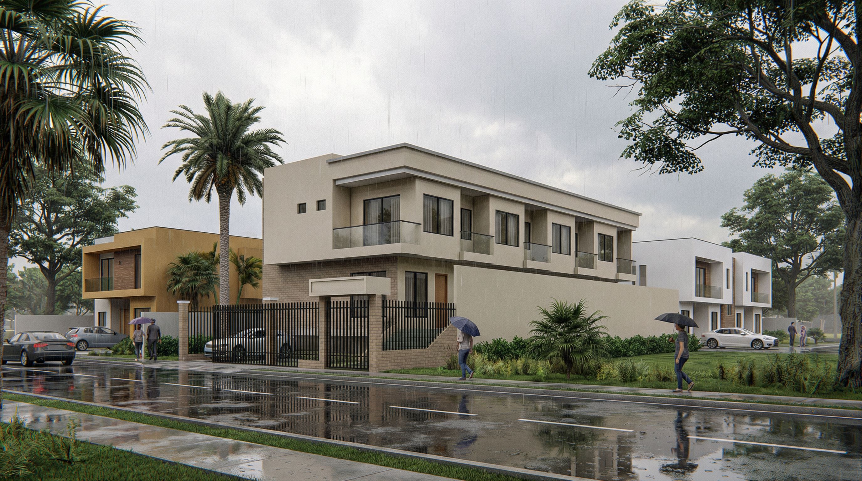 renderizar imagen de un conjunto residencial de dos pisos y cuatro casas. el conjunto tiene a su derecha otro conjunto residencial de dos pisos, moderno de color blanco ya su izquierda una vivienda unifamiliar de dos pisos de color ocre y muy moderna osea se encuentra entre dos propiedades ya habitadas.el conjunto tiene casi todas sus paredes en estuco color beige muy claro y otras en un ladrillo color beige un poco más oscuro, las ventanas son de vidrio transparente y de aluminio color negro mate. el ambiente del render es en una tarde soleada a eso de las tres de la tarde. el render debe tener mucha vegetación y arboles como palmeras y robles., mantenga el ángulo de cámara exacto. Tipo: exterior arquitectónico. Agregue: personas, vehículos, vegetación y árboles,cubierta en lamina termica de pvc. Mantener 100% el diseño original. emparejar el color del ladrillo beige.dia un poco nublado y con algo de lluvia. mantener el diseño original, ELIMINAR EL NUMERO CON LA NOMENCLATURA , keep exact camera angle, keep exact camera angle, keep exact camera angle