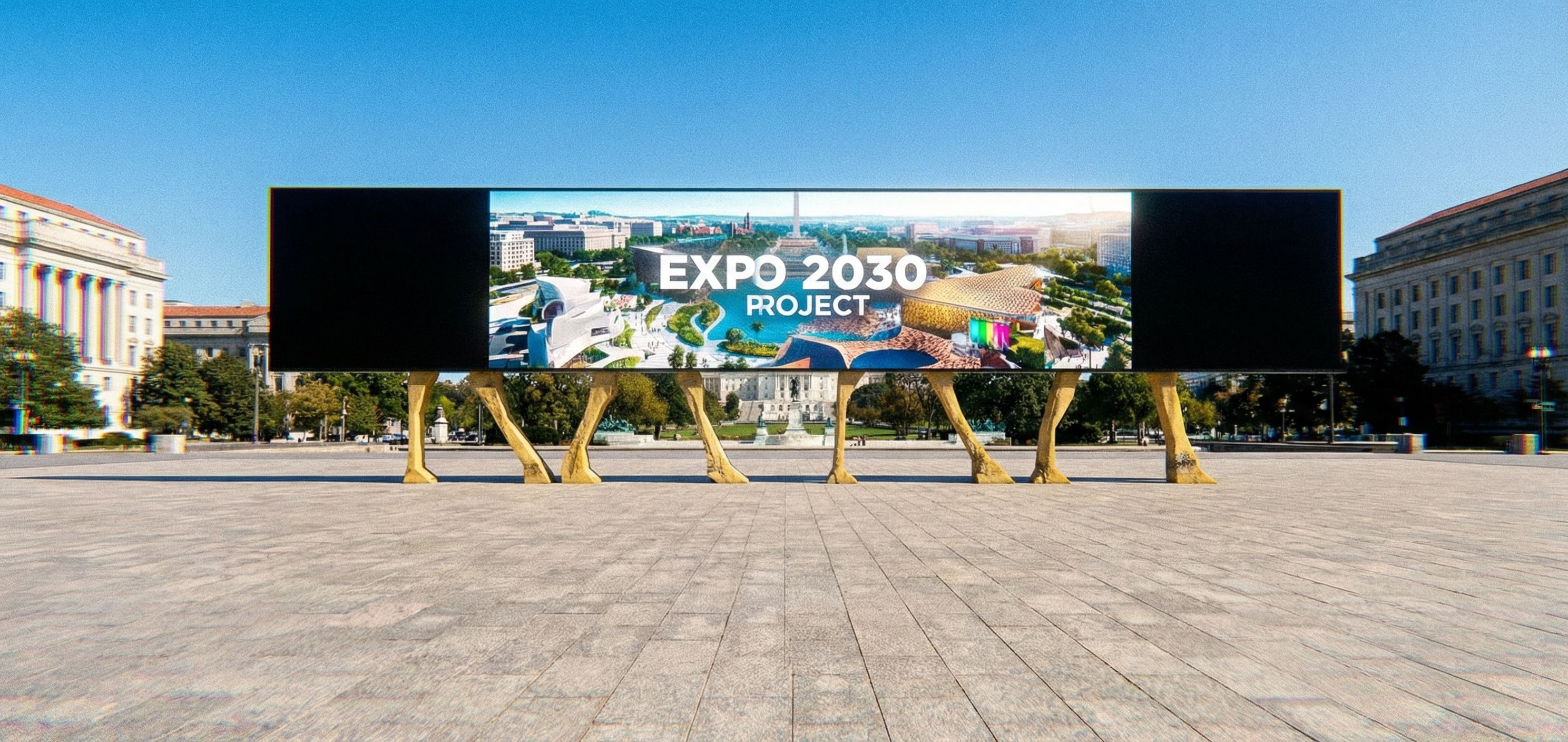 keep exact camera angle , BLACK IS SCREEN , YELLOW IS Riyadh stone , Washington DC , PUT Expo2030 PROJECT ON SCREEN,, keep exact camera angle