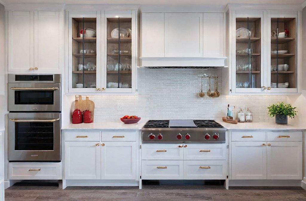 PromptCoastal kitchen wall featuring white cabinets and rift white oak accents, 30" Wolf double oven, 48" wolf rangetop with red knobs, subway tile with pot filler fixture over range. Glass doors on each side of range, deocrative toe kick and crown modling, shaker style doors, gold hardware