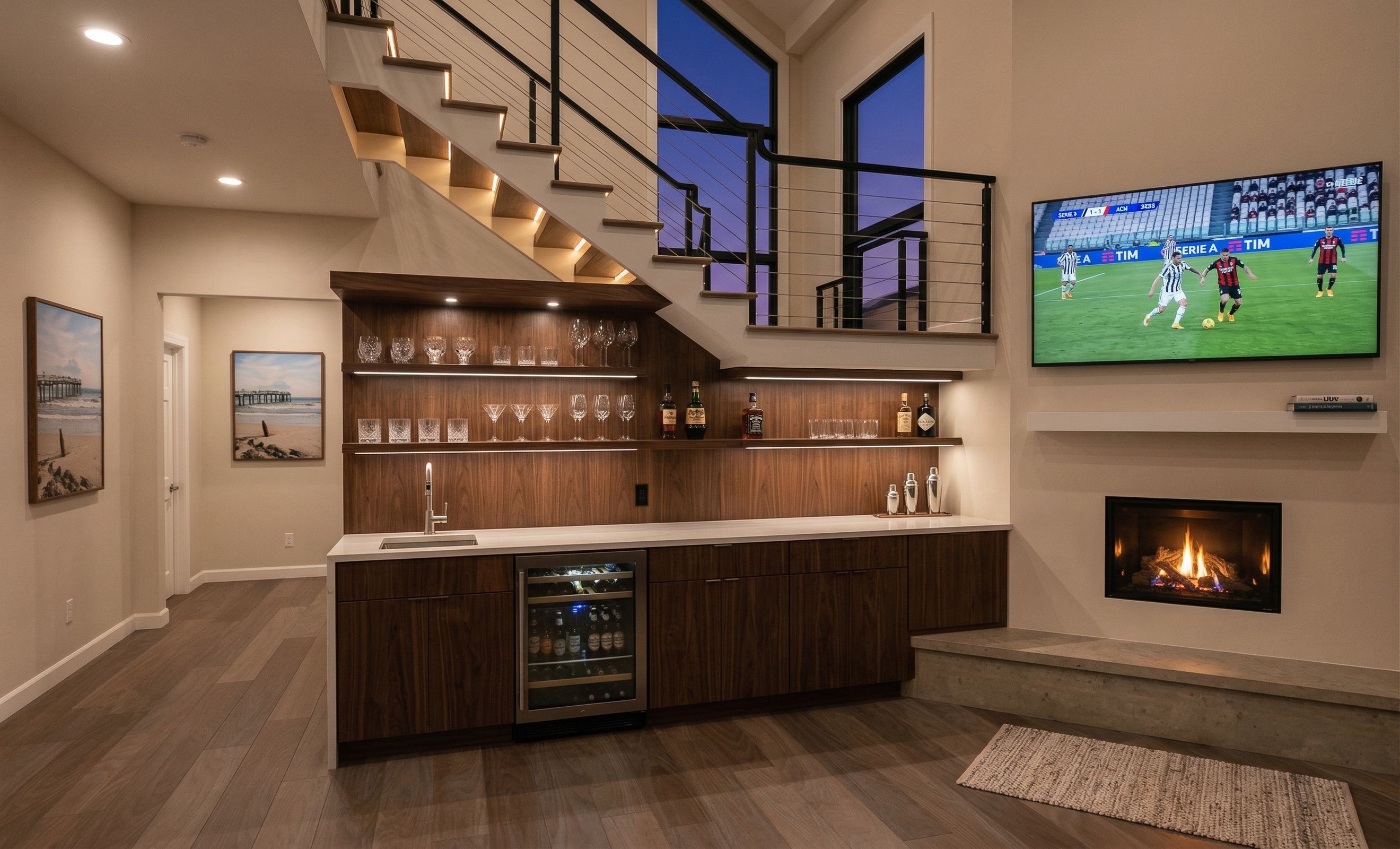 Promptmake photorealistic rendering from this image add wet bar under the stairs next to fireplace as indicated by red area design it so the fireplace and wet bar are connected fireplace is direct vent gas fireplace, show fireplace on burning, fireplace wall is drywall TV above the fireplace is playing Italian soccer game lights on in the room add light fixtures where appropriate, keep exact camera angle