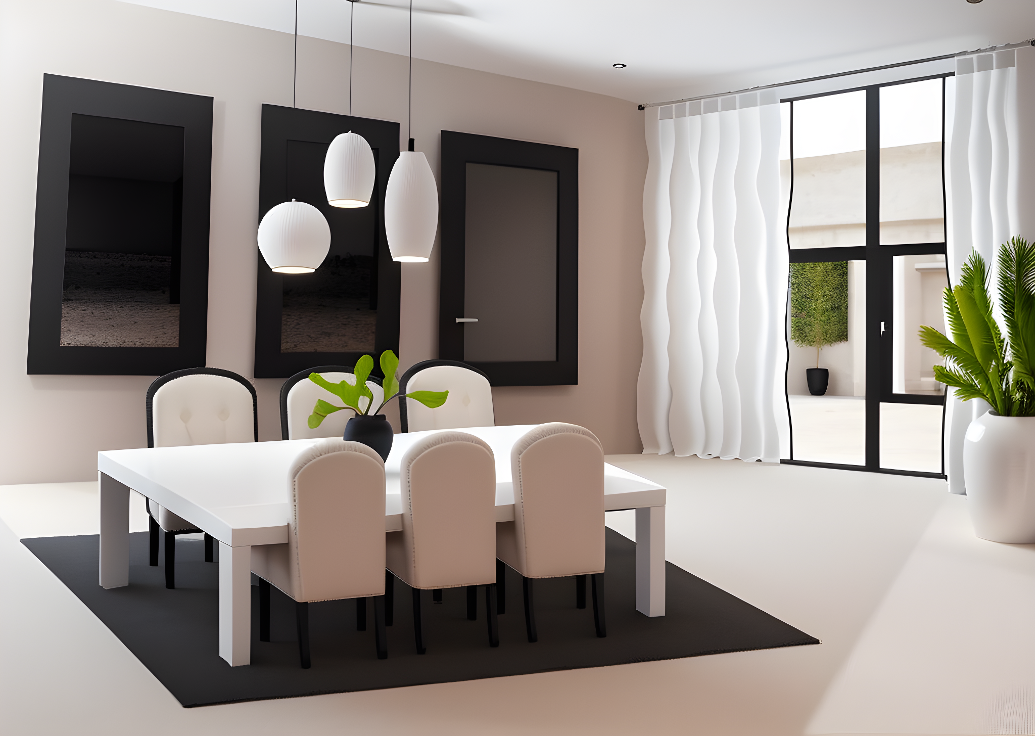 PromptWhite walls, white wall panels, black dining table, beige modern chairs, glass chandler with touch of black, white sheer curtains, beige carpet,