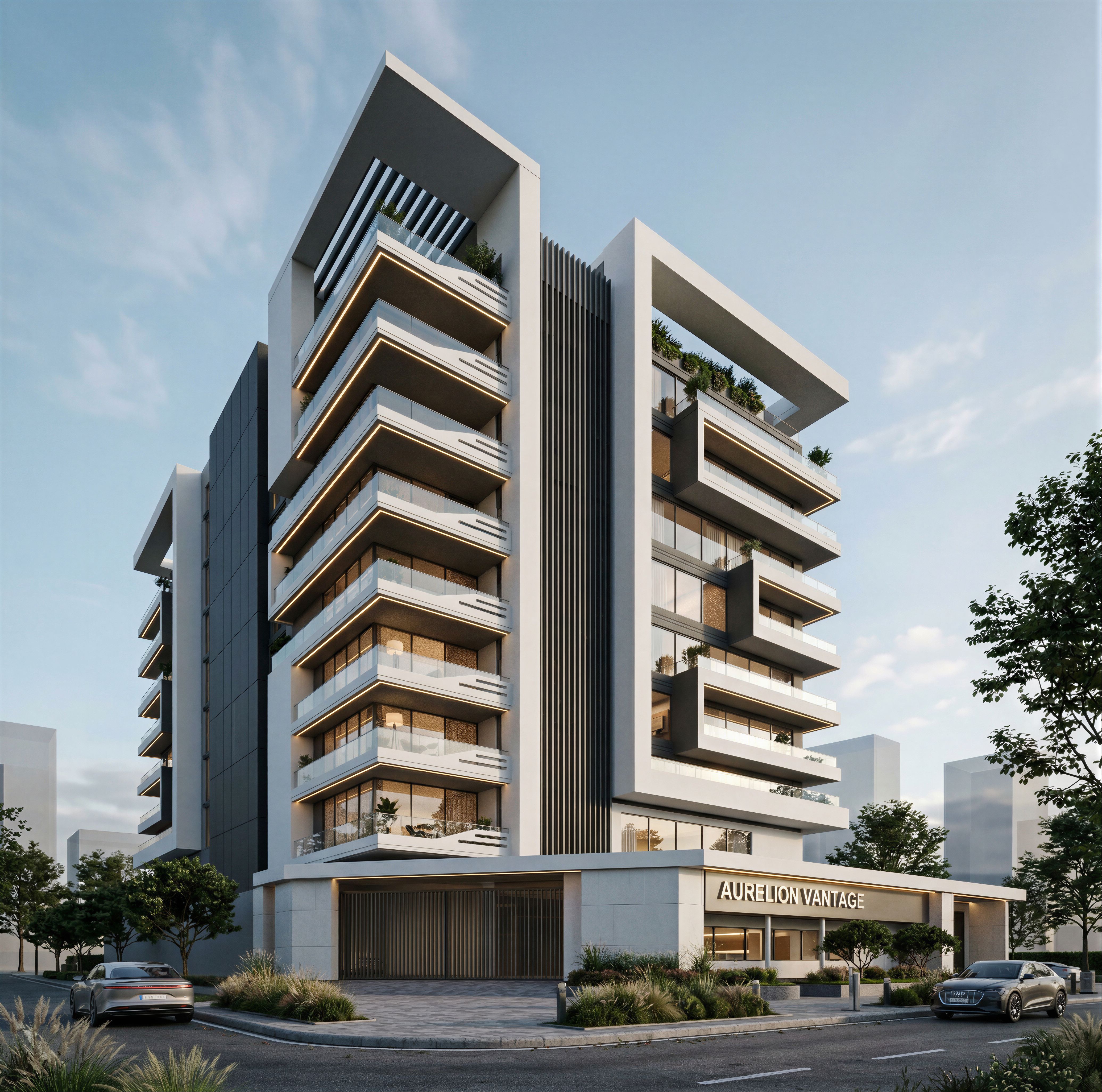 EnhancedPromptA beautiful photo-realistic render of a modern apartment building featuring clean, elegant lines and well-framed glass panels. Sleek glass railings accent the balconies, highlighting the building’s contemporary form. Subtle ambient daylight reflects softly off the glazing, revealing warm interior furnishings and refined material textures inside. There are some walls and under-slab reveals hosting linear striplights with warm light. Wall themes is predominantly White & light grey, entrance gate house has some curtain wall glazing on the front. The exterior environment is highly detailed — landscaped walkways, gentle shadows, realistic vegetation, and calm, ultra-sharp details, accurate reflections., keep exact camera angle