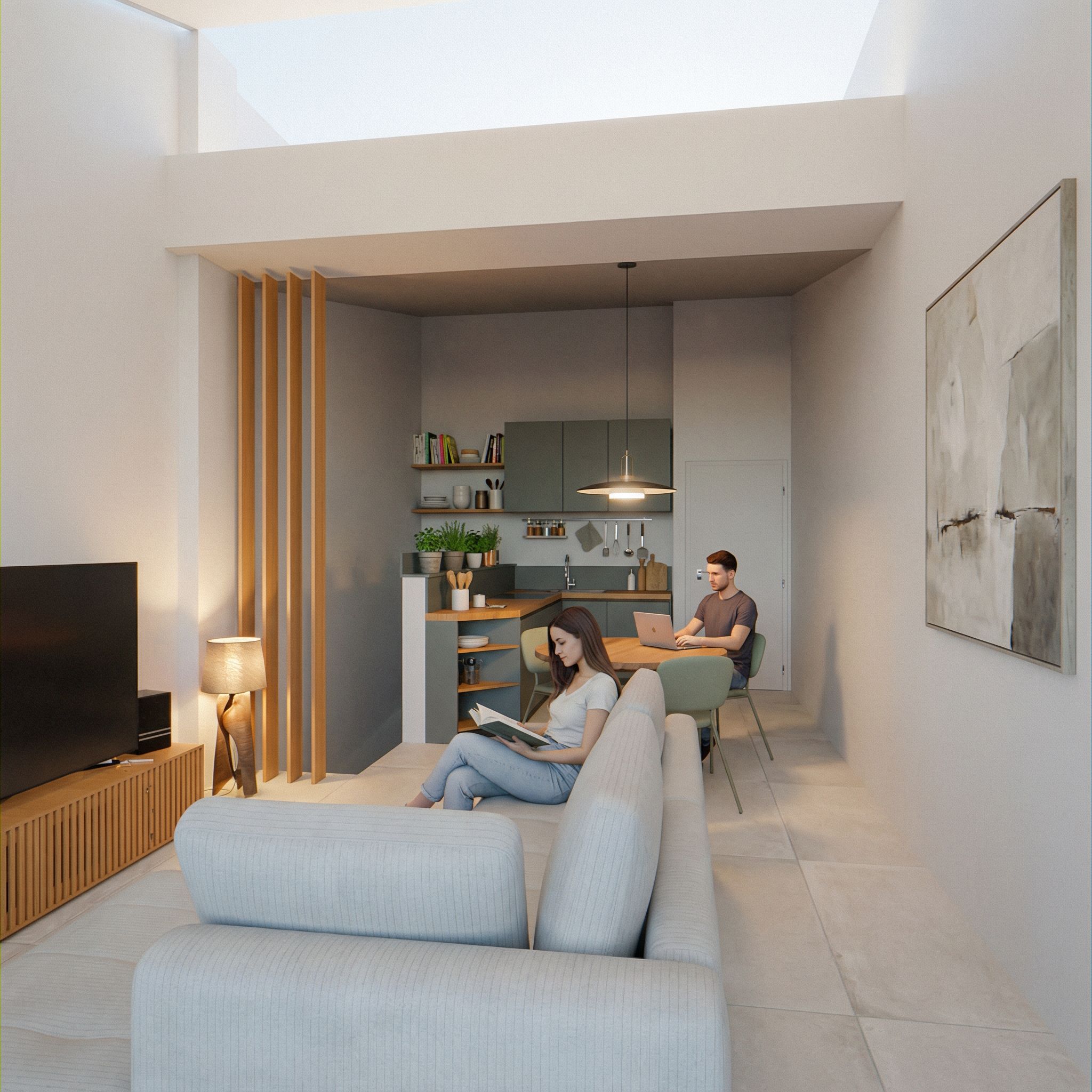 You are professional photographer and expert architect, you role is to transform the input into realistic photograph and add photography effects like chromatic abberation, ISO noise, Film grain, Sharpening pass, Soft glow, Exposure correction, Tone mapping, Bloom + glare mix. Composition: Always keep same input composition and camera angle, accordingly NEVER EVER crop the input or change the angle unless otherwise is mentioned in the user instructions regarding camera angle or composition. For example: if input is a tower, it should be fully visible. Additional guidance: consider the user instructions provided below to help you. Text: if input contains text, ensure to render it correctly. Errors: final output should be 100% correct without any errors or strange things. Input type: you are expected to handle different input types like clay model inputs, freehand sketches, photos, you have to think first how to transform each one into an ideal photograph Creativity and adding details: exteriors: add elements like landscape, context if needed to make the scene perfect award-winning shot. interiors: materials, textures, interior accessories,..etc. Final Result: final result quality always should tend to look like a realistic photograph unless user specifies different style below. User Instructions: "Add ceramic tiles floor ENERG. CORSOCOMO MERINGUE 60X120. Add some kitchen book and other stuff on the kitchen shelves, do not add shelves or modify kitchen layout. Add pending lamp on the table, and a floor design lamp on the right side of the tv furniture. Add abstract painting on the right wall above. Add 2 people in the room. Pay maximum attention on maintaining exact camera angle and framing and exact room and corridor dimensions, no other variations allowed., keep exact camera angle. Type: interior design. Input: 3D mass model"