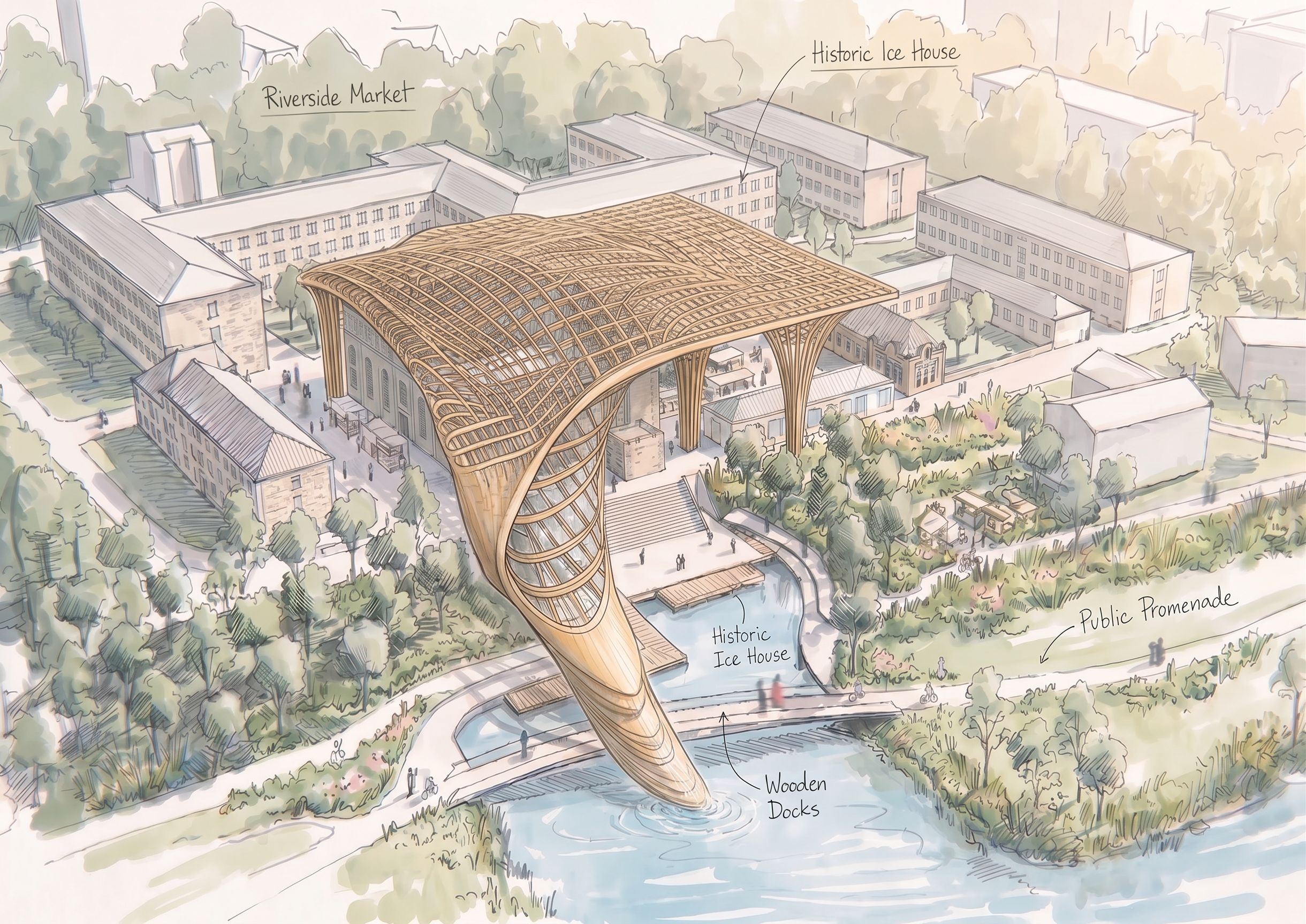 PromptCreate an architectural visualization like a ilustration based on the provided model image. Keep the exact geometry, proportions, and placement of the main historic building unchanged. Preserve the roof structure exactly as designed — including its curvature, span, and all supporting columns. The roof must remain only above the main building volume (not extending over surrounding structures). Transform the inserted black-and-white roof into a cohesive, unified architectural element: refine it into a fluid, organic structure inspired by a lightweight lattice/parametric system (similar in logic to Metropol Parasol), while strictly following the original shape and structural logic. Emphasize continuity and flow. The front tip of the roof must extend smoothly and naturally into the river, transitioning into a sculptural spiral or tapering structure that touches the water in a soft, continuous gesture — no abrupt endings. This connection should feel elegant, integrated, and intentional. Maintain all original columns, their positions, and structural rhythm. Do not alter the footprint, scale, or layout of the building or surroundings. Style: atmospheric architectural illustration, slightly artistic (not photorealistic), soft lighting, subtle textures, with emphasis on the roof structure as the main design feature., keep exact camera angle