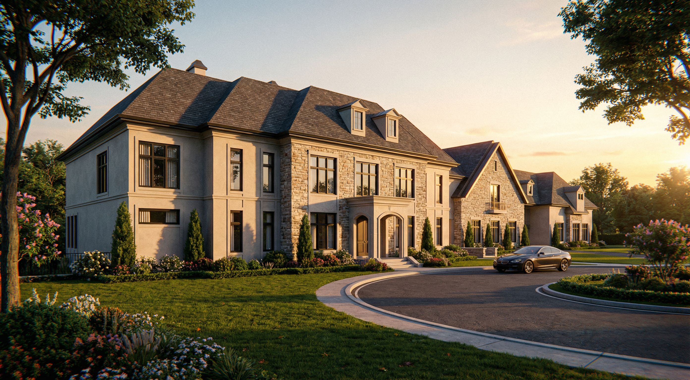 Photo of an elegant residential estate featuring a mix of contemporary and traditional design elements. Focus on the intricate façade with varied textures, including stone and smooth stucco. Nestled in a landscaped area, the round driveway enhances the grandeur. Natural light casts soft shadows, capturing the time of day just before sunset. Perspective from a low angle, using a wide lens to highlight the height and detail of the structure, while framing the surrounding greenery and subtle architectural accents., keep exact camera angle, keep exact camera angle