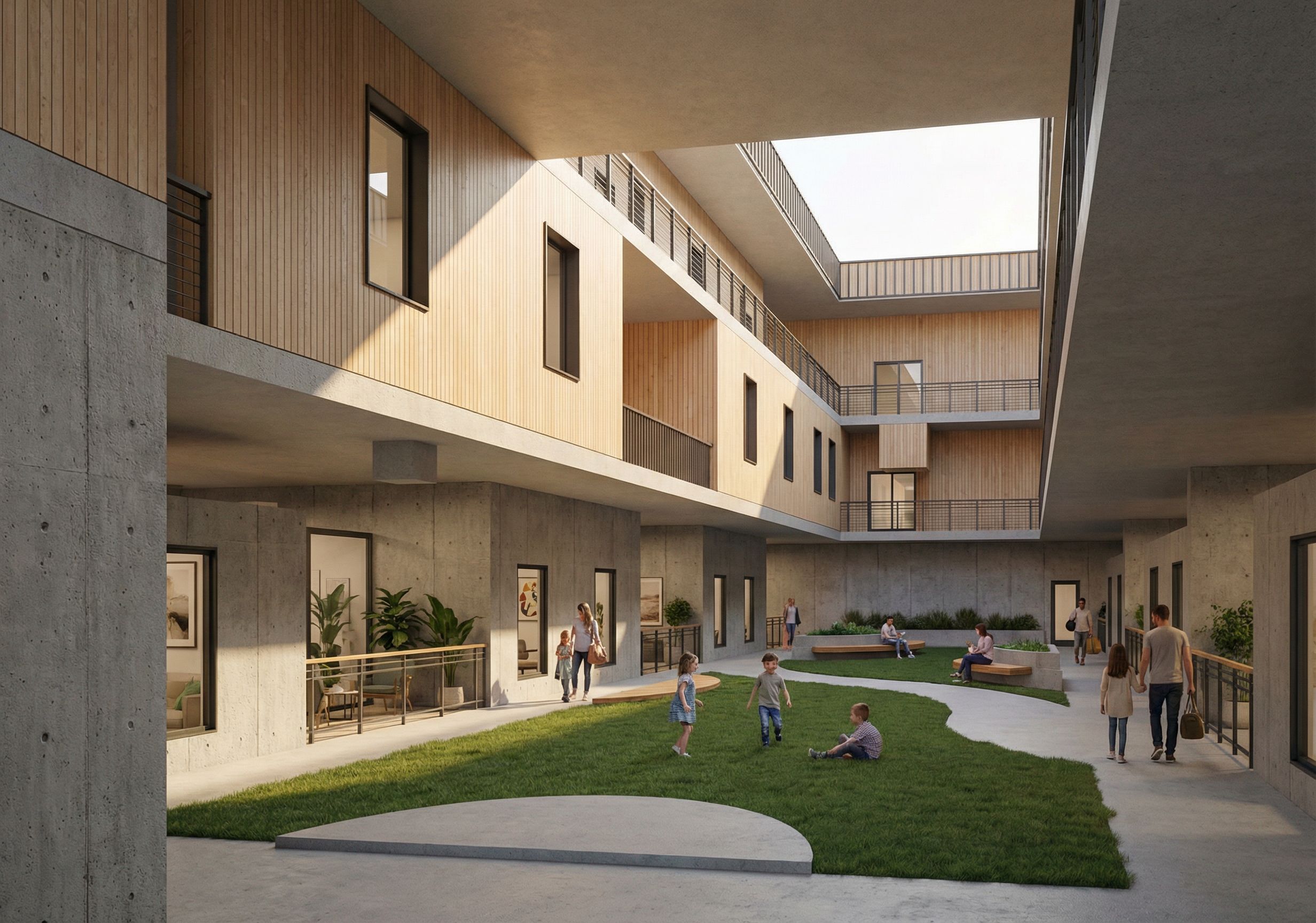 interior design rendering, render this 3D mass into artistic illustration, Render the courtyard of a three-story multi-family residential building with the same geometry, lighting, and composition as the original image. Keep the architectural clarity and minimal white context consistent with the other renderings. The building materials should stay realistic: concrete base Type I at the ground level and light-toned wood or composite siding above. Maintain dark aluminum window frames and metal railings. The courtyard landscape has natural grass not bright green with soft shaded seating areas, planters, and concrete walkways. Add subtle human presence—families, kids, or residents sitting or walking—to express the communal quality of the space while keeping it subtle and architectural. Use warm late-afternoon sunlight to soften shadows and highlight depth between balconies, circulation, and openings. The atmosphere should feel calm, inclusive, and lived-in, showing how families share open space within a protected inner courtyard. Keep the style consistent with your previous renders: clean, high-resolution, with realistic materials and soft contrast against a white sky background. Final output should look like a professional architectural visualization that captures the warmth of collective life and the spatial openness of the courtyard., keep exact camera angle, including people, furniture, indoor plants, artwork and decorations, high quality, professional, detailed scene