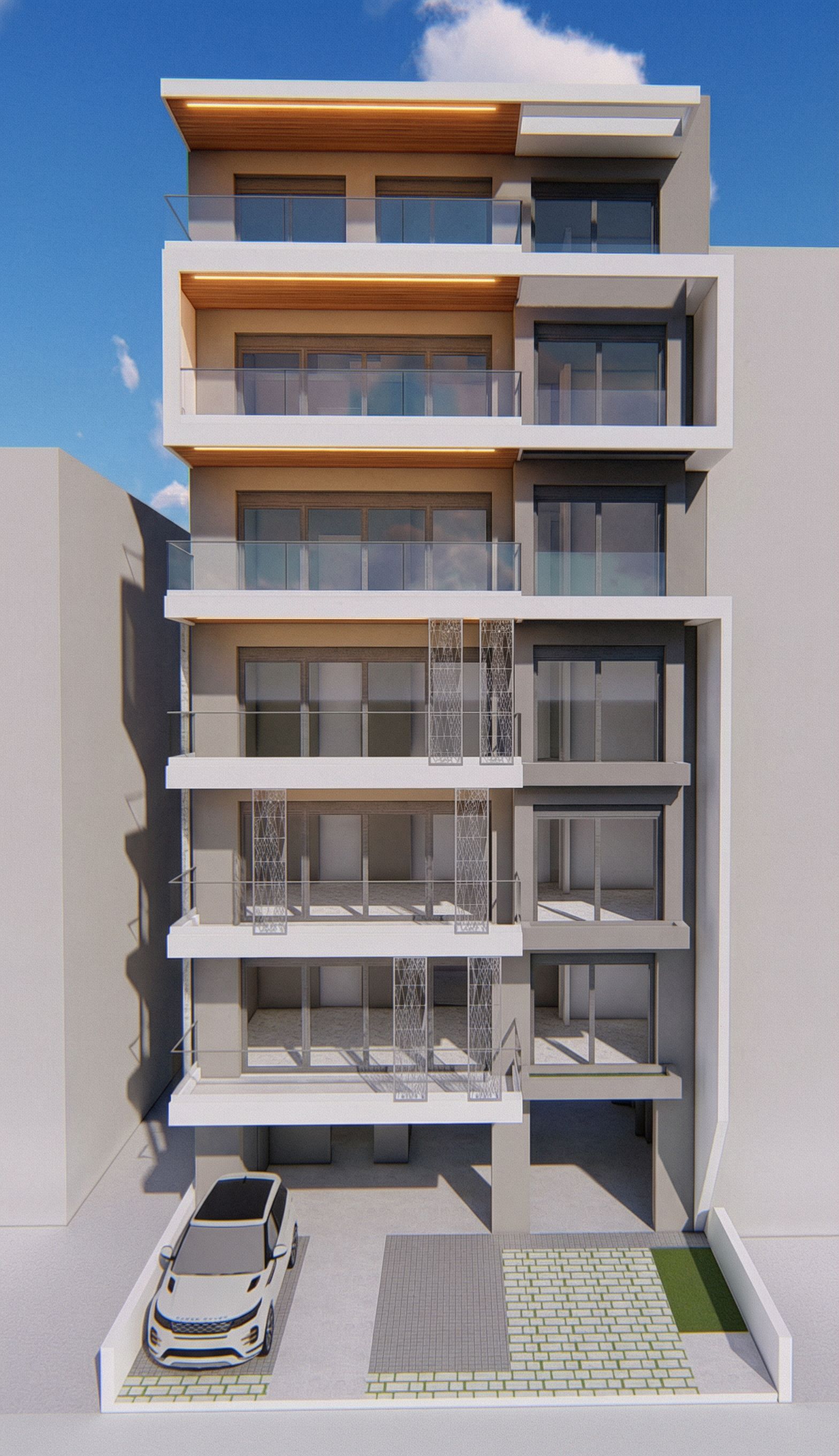Photo of a modern apartment building featuring sleek lines and contemporary balconies. Emphasize , expansive glass windows, and wooden tops of balcony accents. Capture natural sunlight enhancing the architectural details, with soft shadows cast by the balconies. Basic color ral 7006 and some beige details with white balconies. Dont change the building. No trees .Do light grey the right and left box. Grammical Light in the wooden balcony, keep exact camera angle