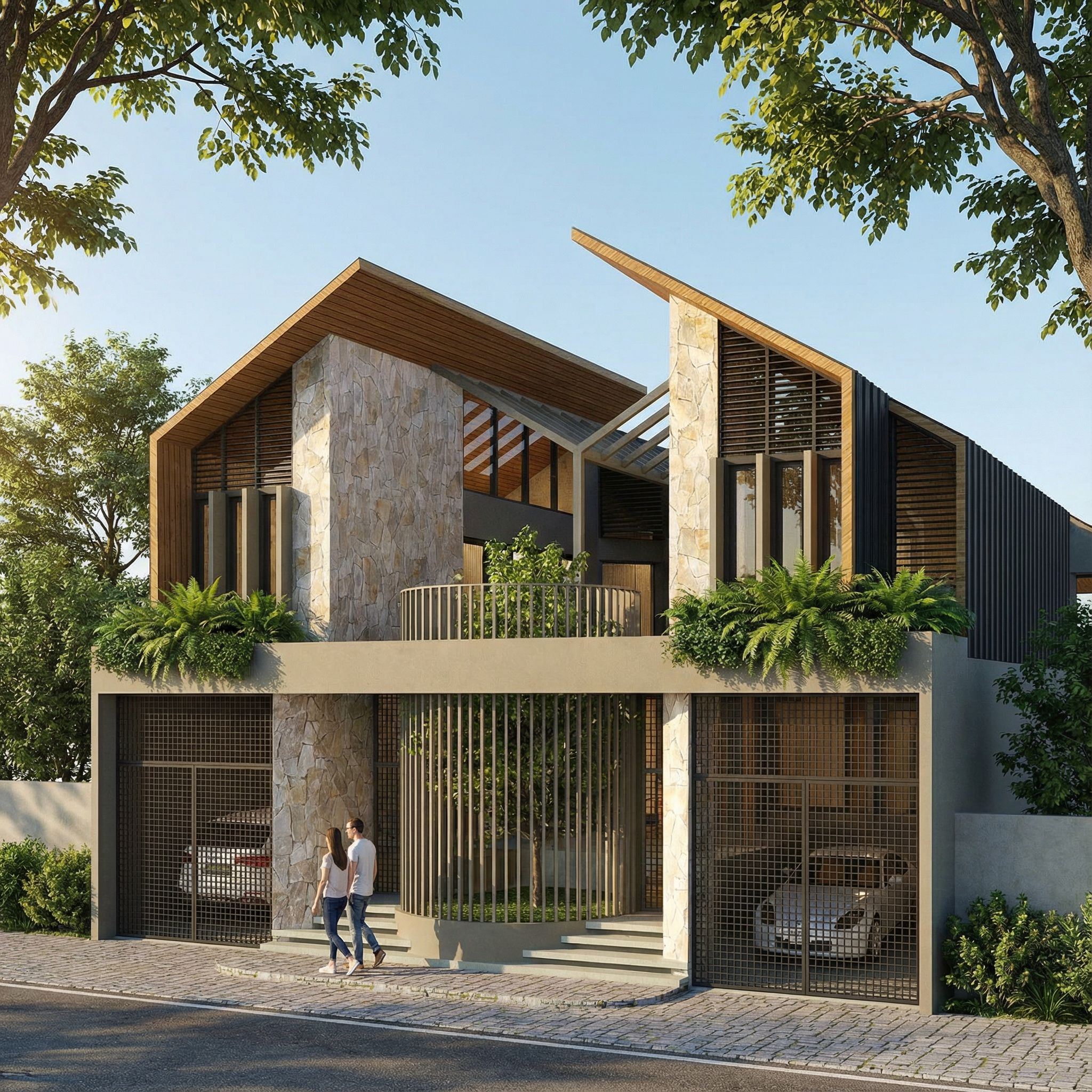 Promptarchitectural exterior rendering, render this 3D mass into photorealistic rendering, MAKE IT HYPER REALISTIC, RETAIN DRIVEWAY GATE DESIGN, keep exact camera angle, including vehicles, greenery and vegetation, trees, high quality, professional, detailed scene
