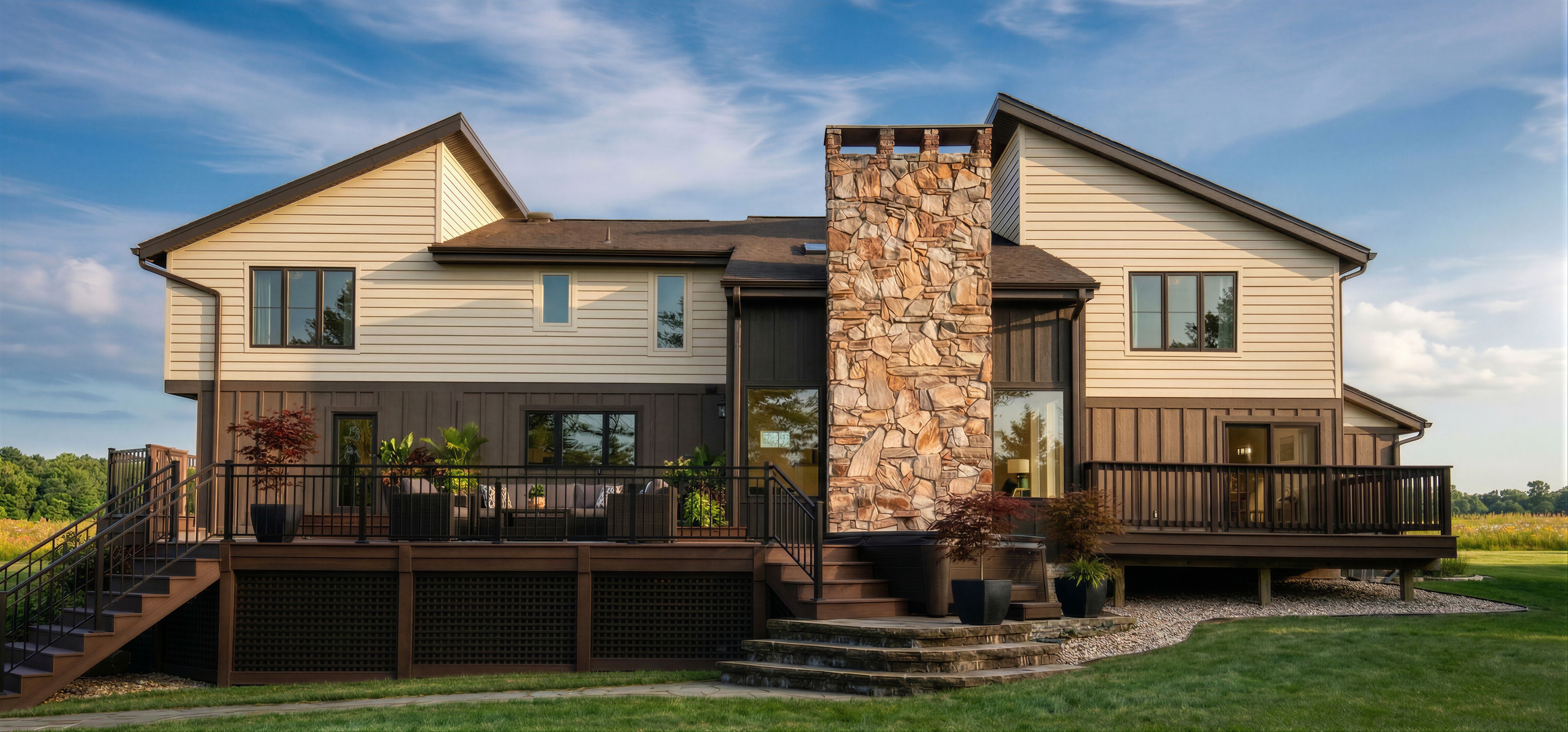Promptthe 2 small windows on the second floor, change the window trim color of those windows to be the same color as the cream siding. , keep exact camera angle