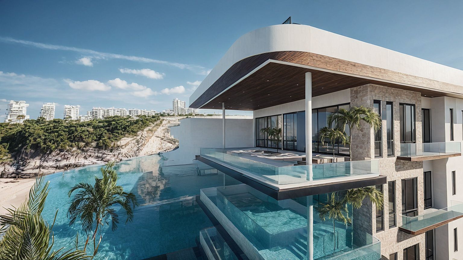 realistic beach background, realistic infinity pool render
