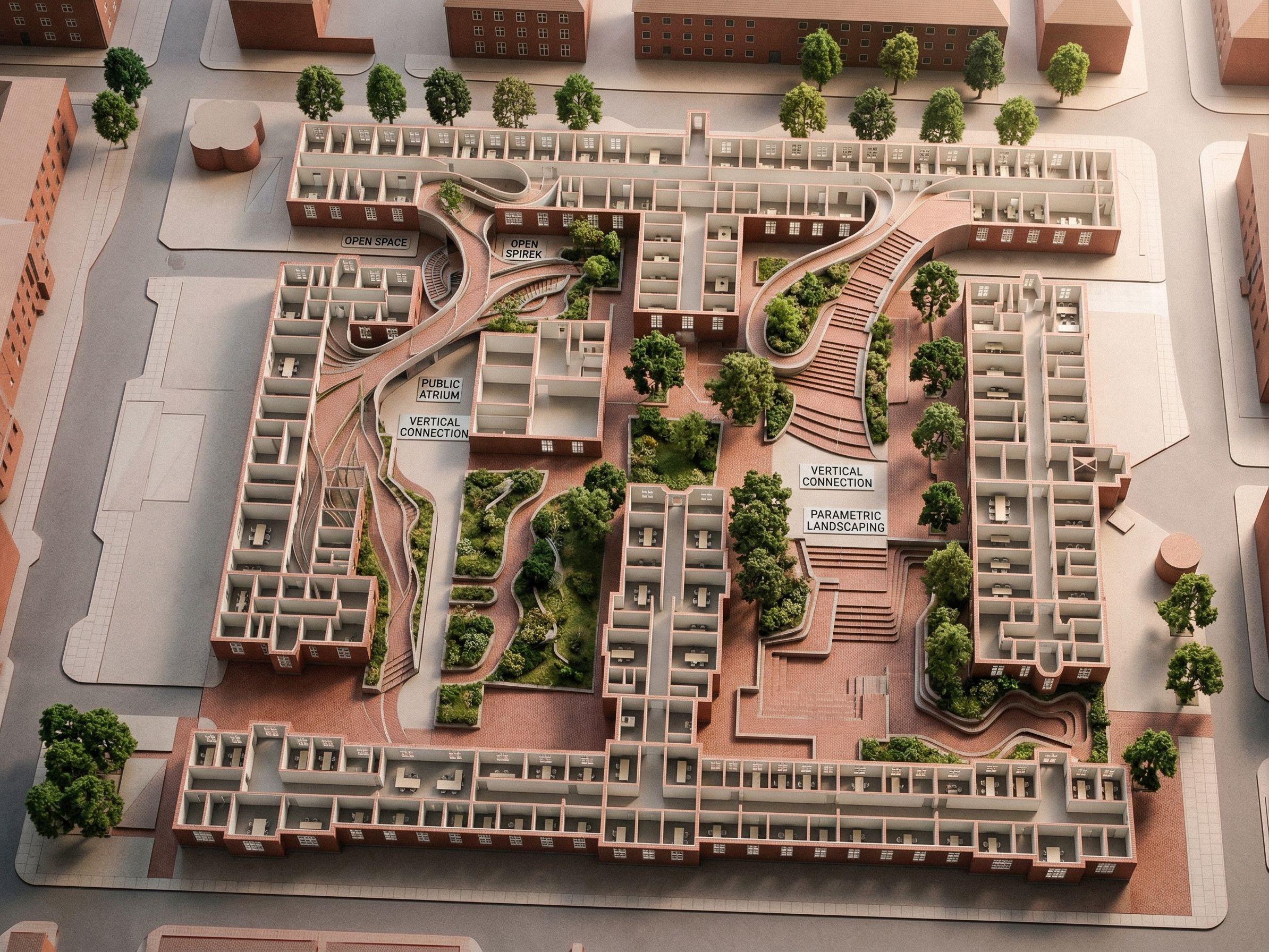 Prompttransforms this technical plan into a rendering of buildings sectioned at an intermediate level, with the same style as the buildings in the reference image1. The curved spaces that intersect with the linear buildings are external spaces composed of ramps, steps, and widenings with green spaces that intersect with the internal spaces and connect different levels of the buildings., keep exact camera angle