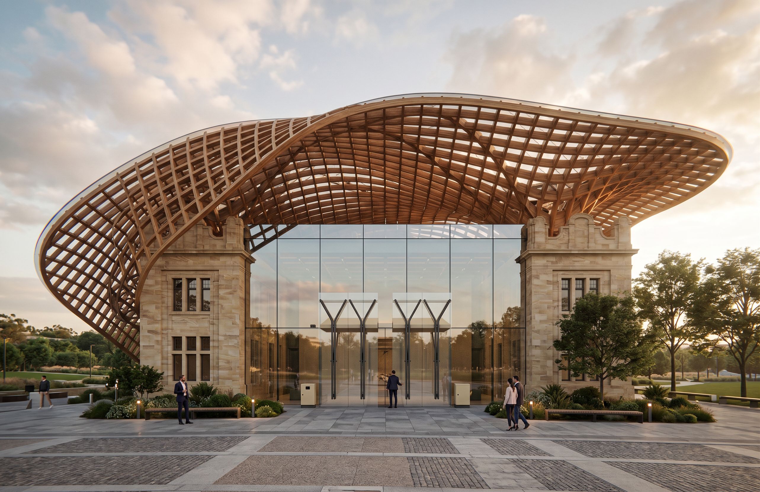 Promptmake the front fasade glass with the glass doors and make the woden roof looks natural with the buliding but dont change shape of anything, keep exact camera angle