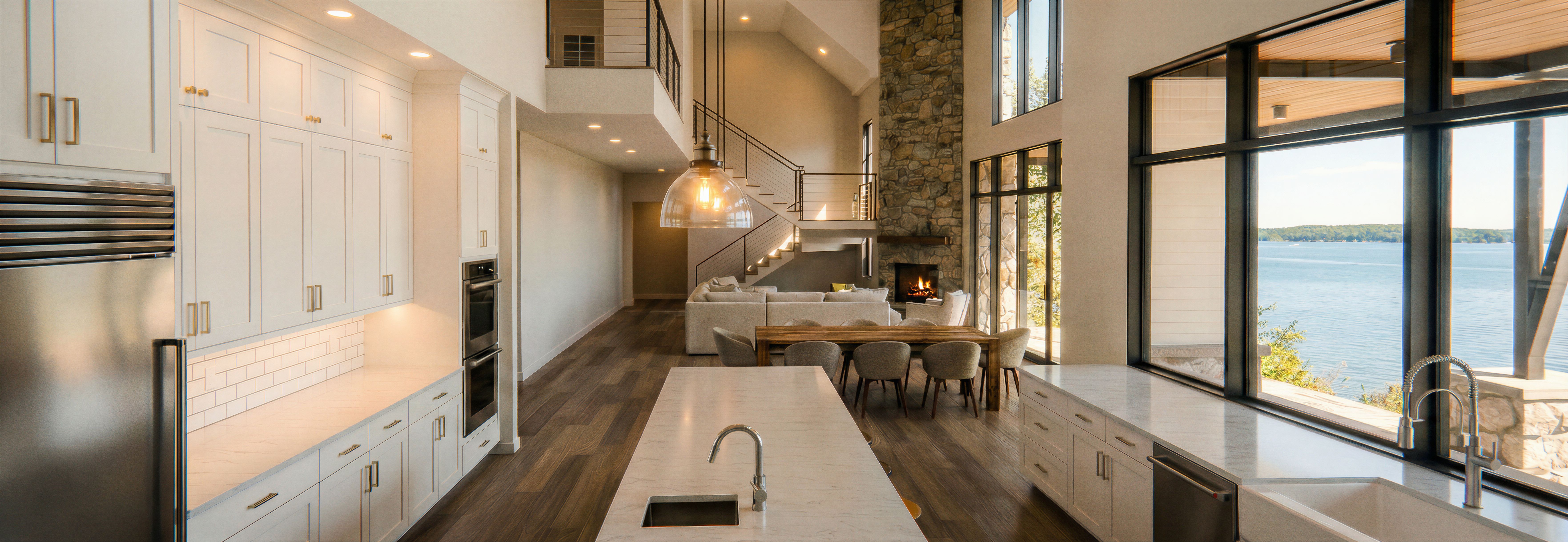 Promptadd white tile backsplash under wall cabinets, turn on light fixtures, keep exact camera angle