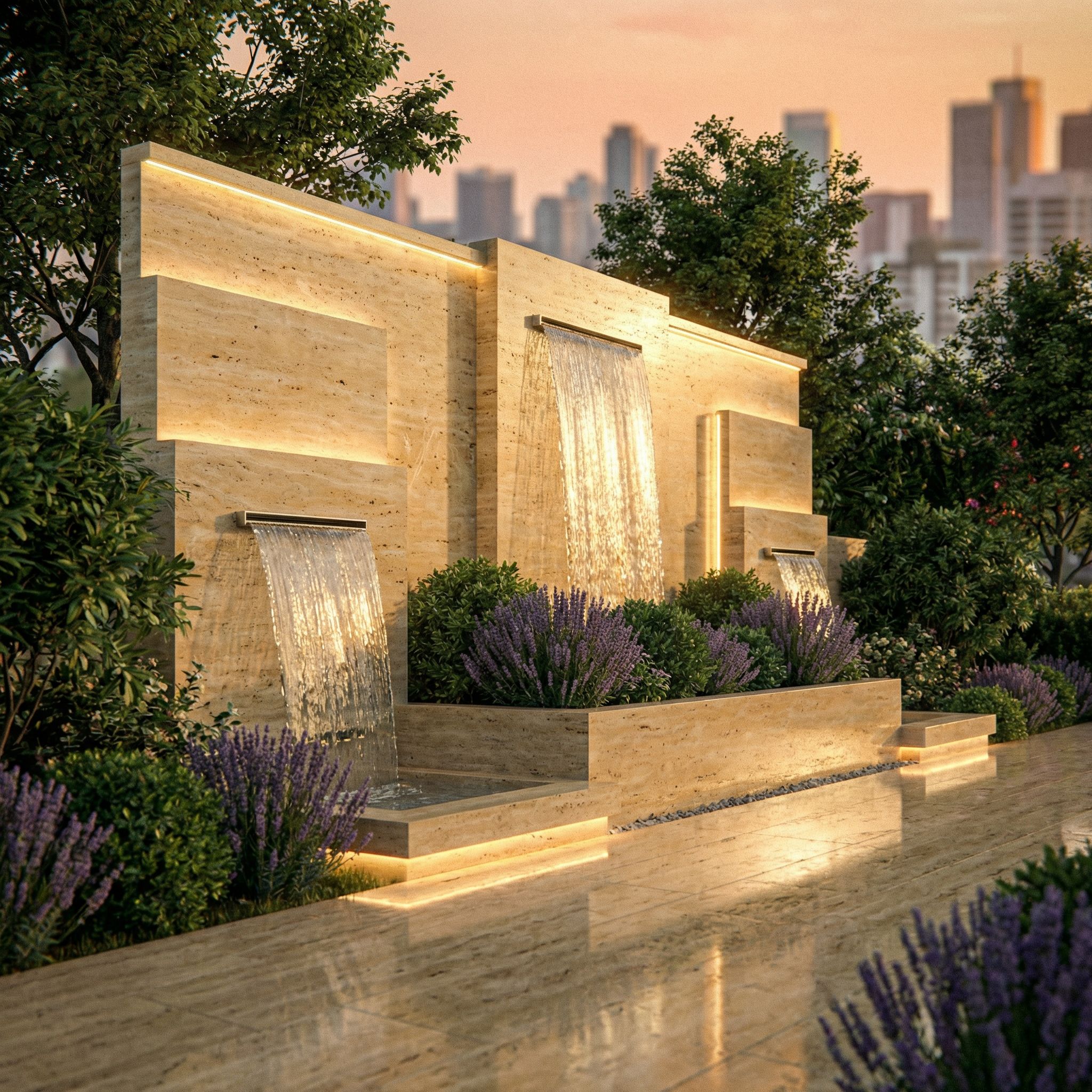 Photo of a modern architectural water feature, highlighting sleek stone walls accented with soft, warm lighting. The design incorporates elegant water cascades framed by lush greenery and lavender plants, creating a serene ambiance. Set in a contemporary urban landscape, the scene is illuminated during the golden hour, enhancing textures and reflective surfaces. Captured from a low angle using a wide-angle lens, the perspective emphasizes the grandeur of the structure against a softly blurred background of the city skyline, showcasing harmony between nature and modern design.