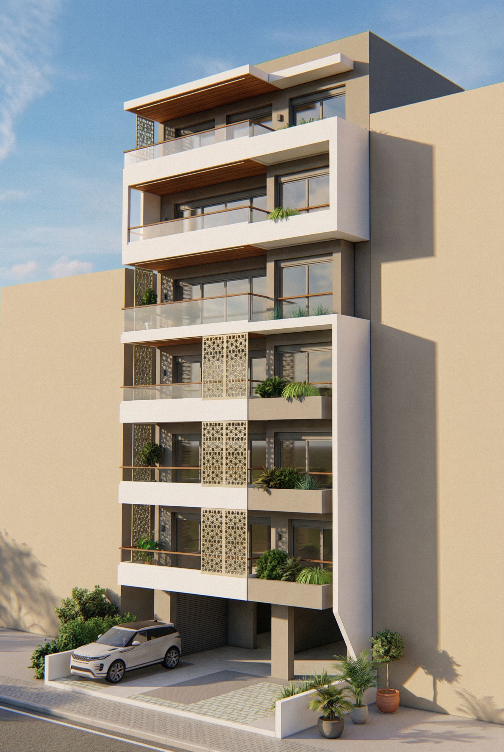PromptPhoto of a modern apartment building featuring sleek lines and contemporary balconies. Emphasize , expansive glass windows, and wooden tops of balcony accents. Capture natural sunlight enhancing the architectural details, with soft shadows cast by the balconies. Basic color ral 7006 and some beige details with white balconies. Dont change the building. , keep exact camera angle