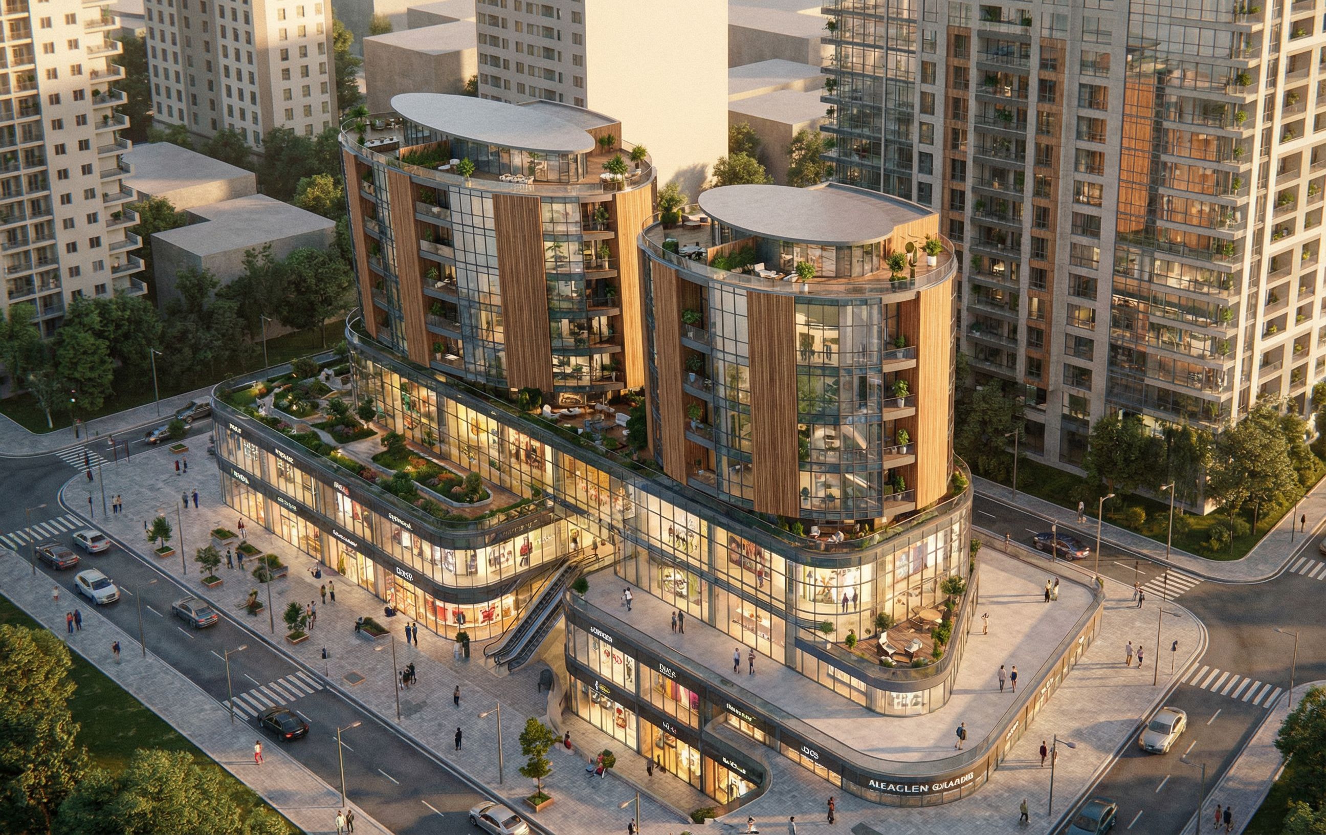 THIS IS A TWO RESIDENTIAL BUILDINGS ON A PODIUM WHICH IS A MALL COMMERCIAL CENTER MAKE THIS UILDING SUPER REAL AND ALIVE& THE RESIDENTIAL TOWERS MUST LOOK ALIVE AND THE MALL MUST LOOK ICONIC THE TWO BUILDINGD MUST BE CLADDED WITH CURTAIN WALLS AND WOOD PANELS DON'T CHNGE THE SCALE OF THE BUILDING DON'T CHANGE THE CAMERA ANGLE OR THE FRAME OF IT DON'T CHANGE ARCHITECTURE MAKE THE MALL CLADDED IN GLASS CHOOSE MATERIALS THAT CAN MAKE THE BUILDING LOOK LIGHTER IN WHEIGHT ,, keep exact camera angle