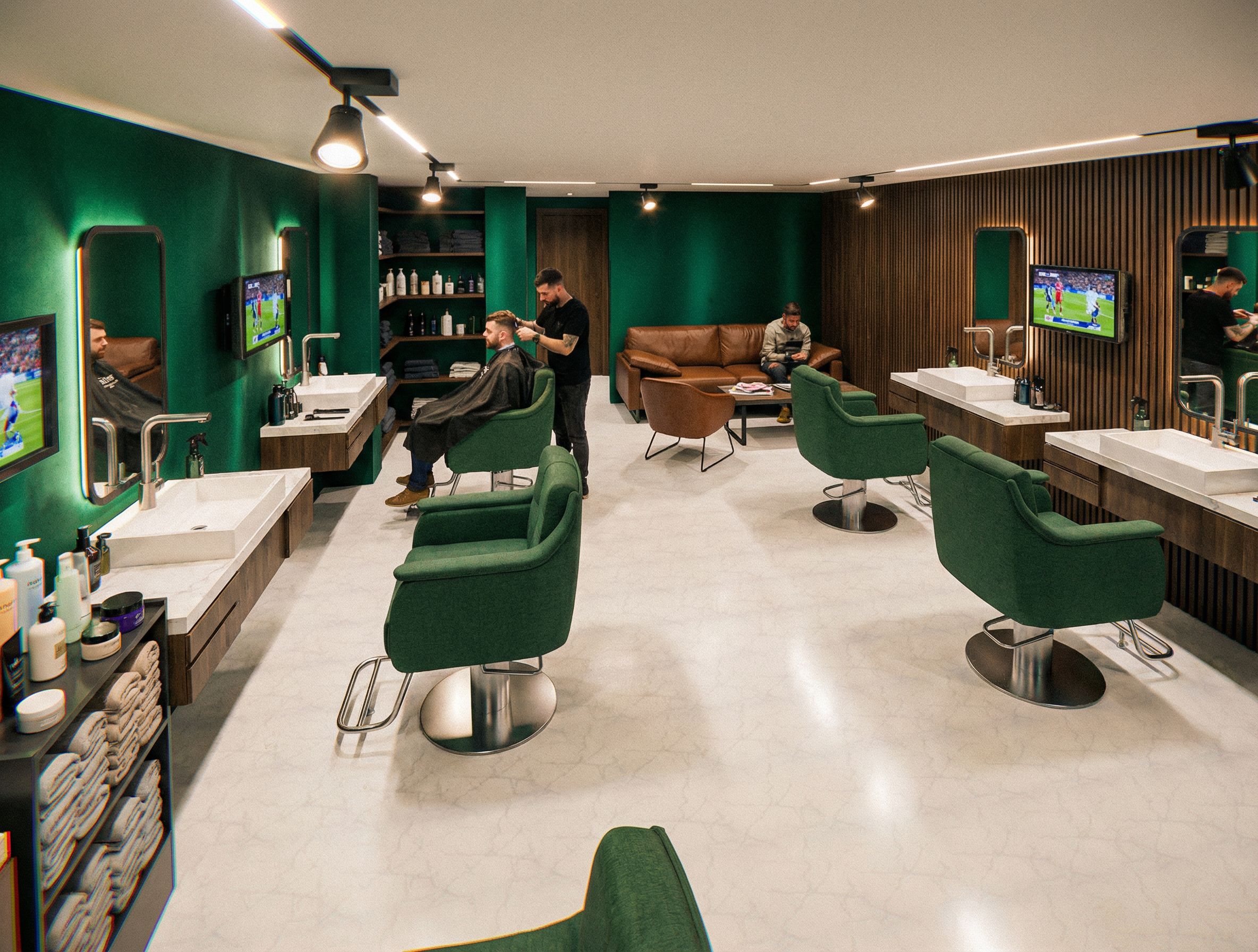 Dont change the angle or the arragment of the furniture. I just want a render this is a barber shop for men. I want you to add a emerald green, satin textured wall on the left, big wall on the right side is out covered with dark oak lamellen. The counter tops and the flooring are white marmor and change the taps as a stainless steel and make them curved.. The cupboards below the countertops are dark oak. The chairs are green but the sofa is leather. on the ceiling there are black big spotlights and slits for led lights. and between teh mirrors there are TV screens in the left side next to the last chait there is a shelf element dull of towels and lotions., keep exact camera angle