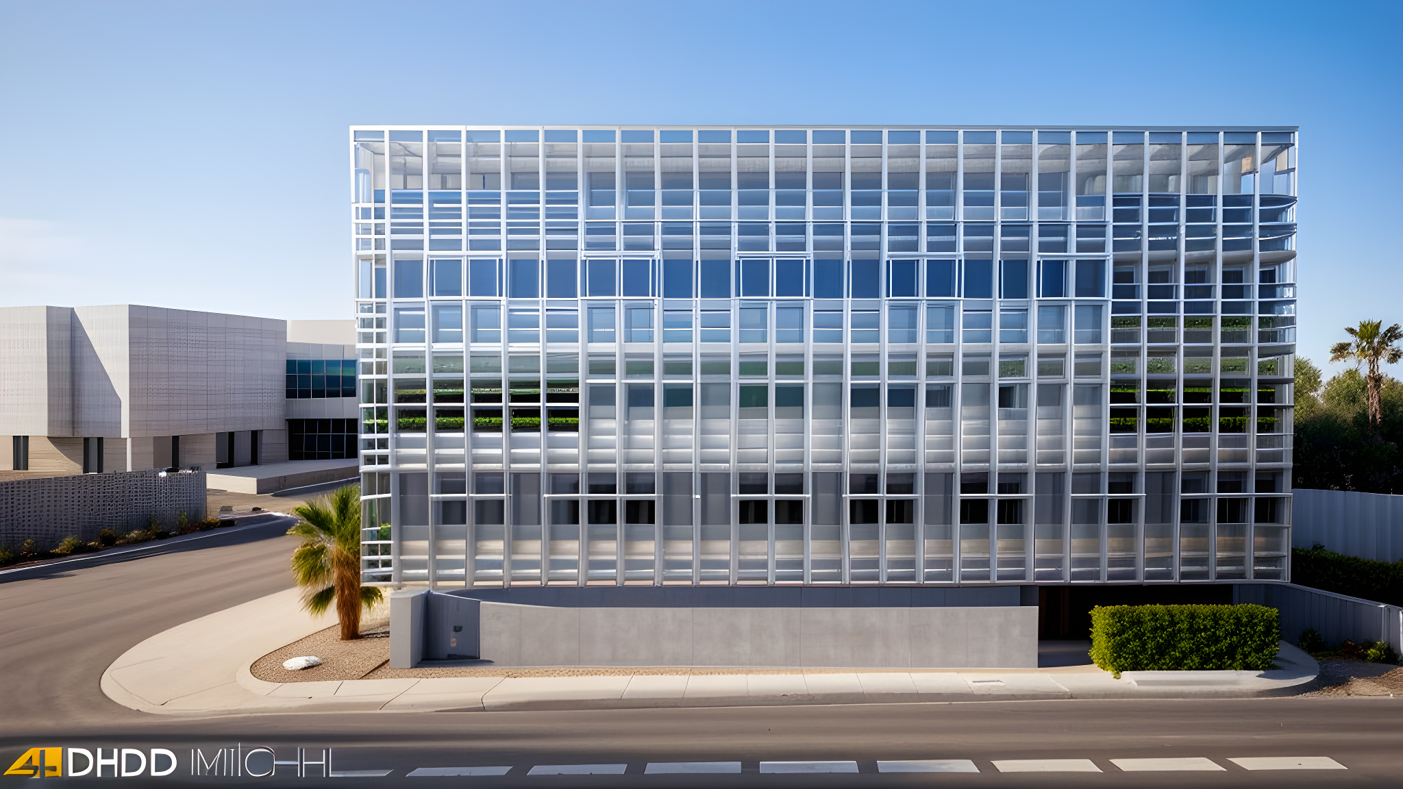 Promptphoto of a modern medical clinic, perforated metal sheet facade