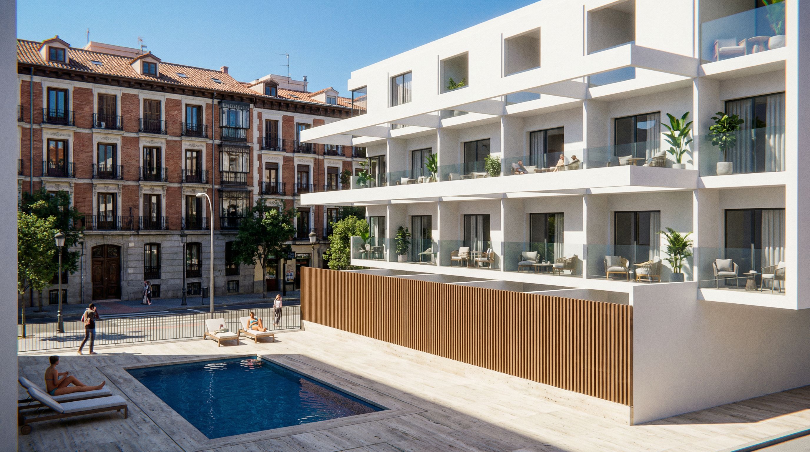 Promptgenera un render realista moderno, RESPETA LA VOLUMETRIA, el volumen blanco es un edificio de viviendas con ventanas esta en madrid en chaqmberi, usa travertino para los suelos y un azul profundo para la piscina.Unified, bright midday sun under a clear blue sky, casting defined, realistic shadows that respect the architecture of both the modern and historical buildings. Cinematic, professional quality. 8k, ultra-detailed.A high-resolution, photorealistic architectural render merging the modern villa and pool patio from image_4.png with the historic Chamberí neighborhood background , keep exact camera angle