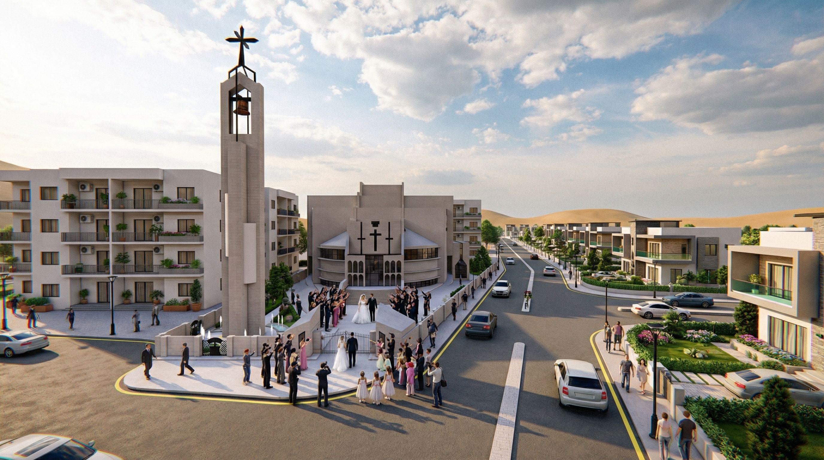 this is a scene of a church make the scene super realistic and the boxes on the right are villas make the streets realistic.. add to it cars AND PEDESTRIANS AND ENHAABCE THE MODELLING PROBLEMS AND THE PAVEEMNTS.. THE CHURCH HAS A CHRISTIAN WEDDING AND A GROOM AND A BRIDE COMES TOGETHER OUT OF THE CHURCH MAKE SURE THAT THE SCALE OF PEOPLE ARE 170 CM AND THE BELL TOWER IS 30 HIGHT .. THE BOXES ON THE RIGHT ARE VILLAS THE BUILDING ON THE LEFT OF THE CHURCH IS A RESIDENTIAL BUILDING THAT HAS APPARTMENTS PLEASE MAKE SURE THAT PEOPLE ARE SHORTER THAN THE CHURCH GATE A LITTLE .., keep exact camera angle