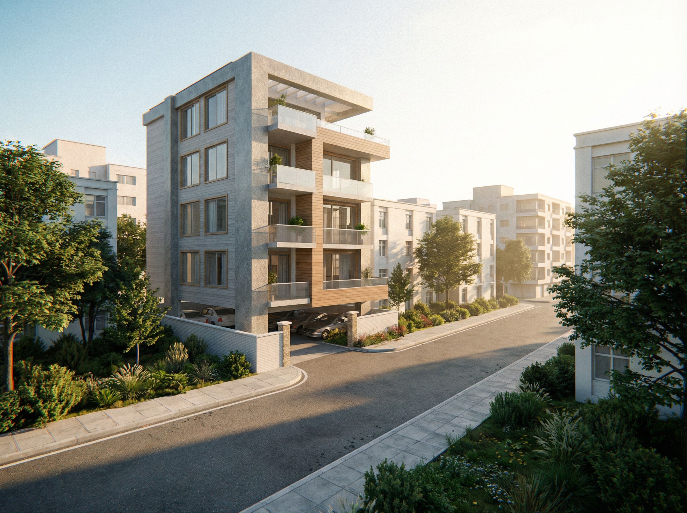PromptModern residential apartment in an urban neighbourhood,lighting,natural vegetation, keep exact camera angle
