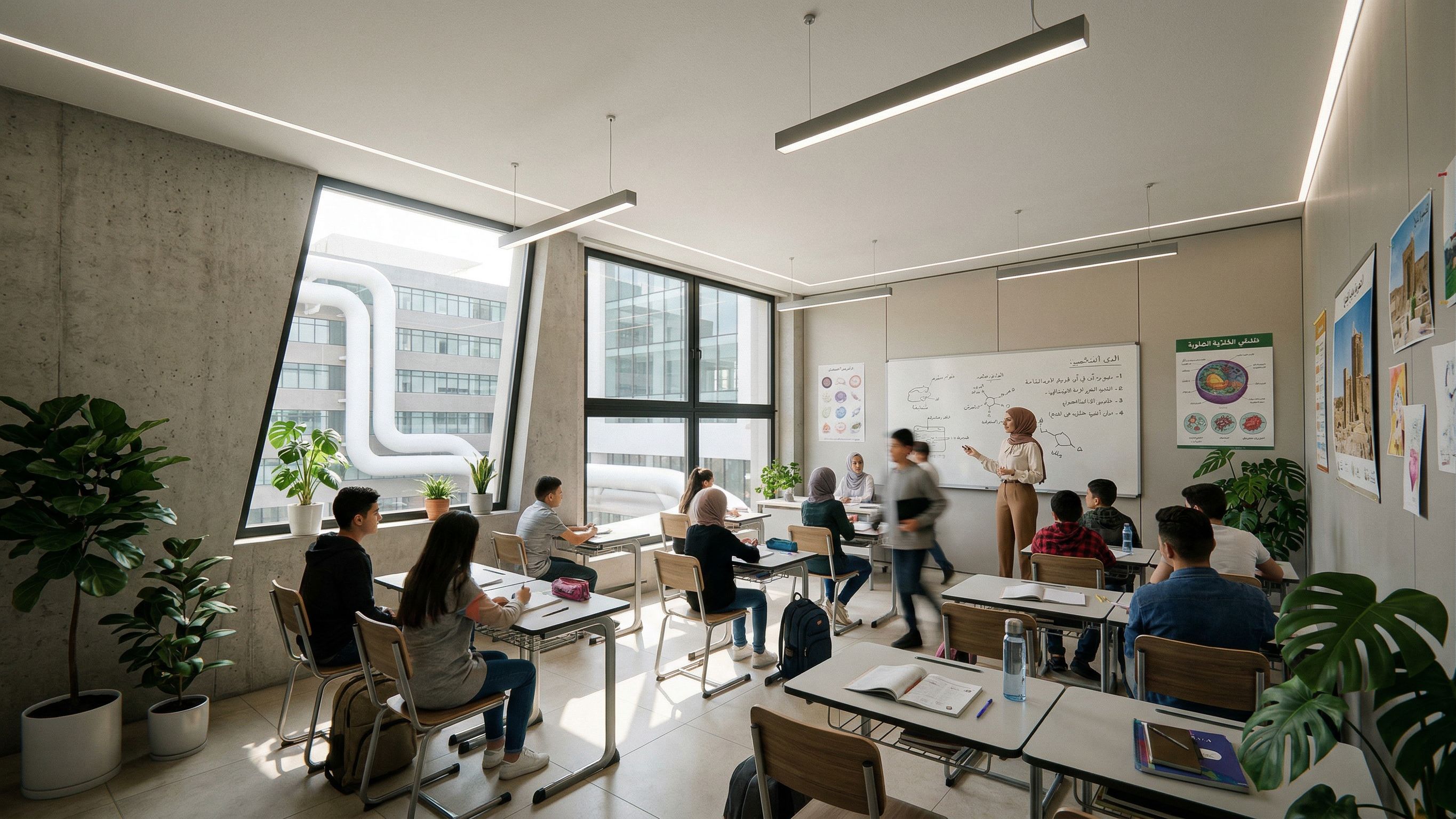 Promptit is the interior 0f a modern Syrian school and it shows the inner classroom ...