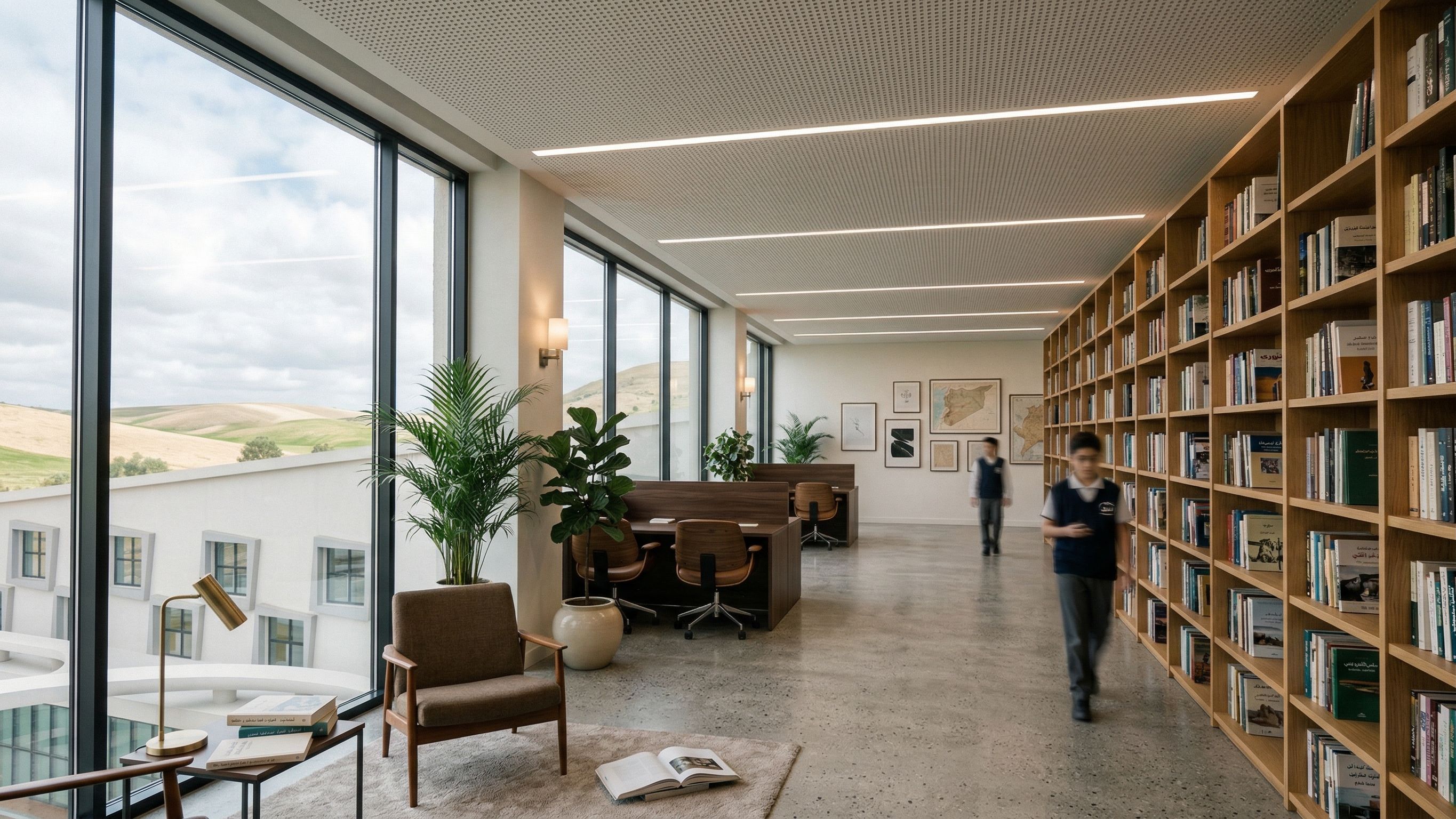this is a scene from the library of a modern Syrian high school and it shows the book shelves and the reading areas .. do simple interior design for this hall and make it super realistic and quiet to read there , keep exact camera angle