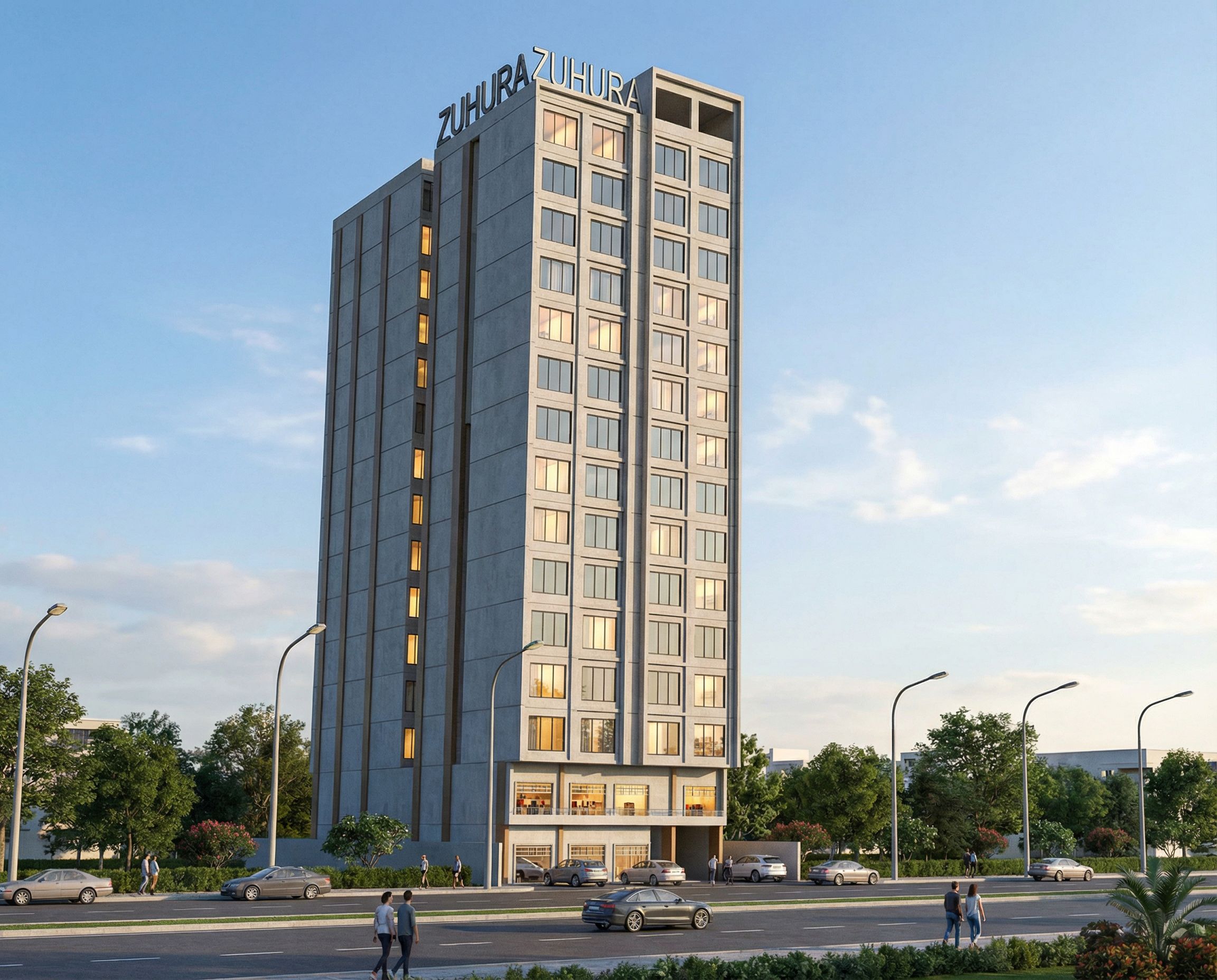 Promptarchitectural exterior rendering, render this photo into photorealistic rendering, WARM SUMMER MORNING WITH SOME LIGHTS TURNED ON IN THE BUILDING. HAVE THE GRAPHICS "ZUHURA" ON TOP OF THE BUILDING., keep exact camera angle, bright daylight, natural lighting, including people, vehicles, high quality, professional, detailed scene
