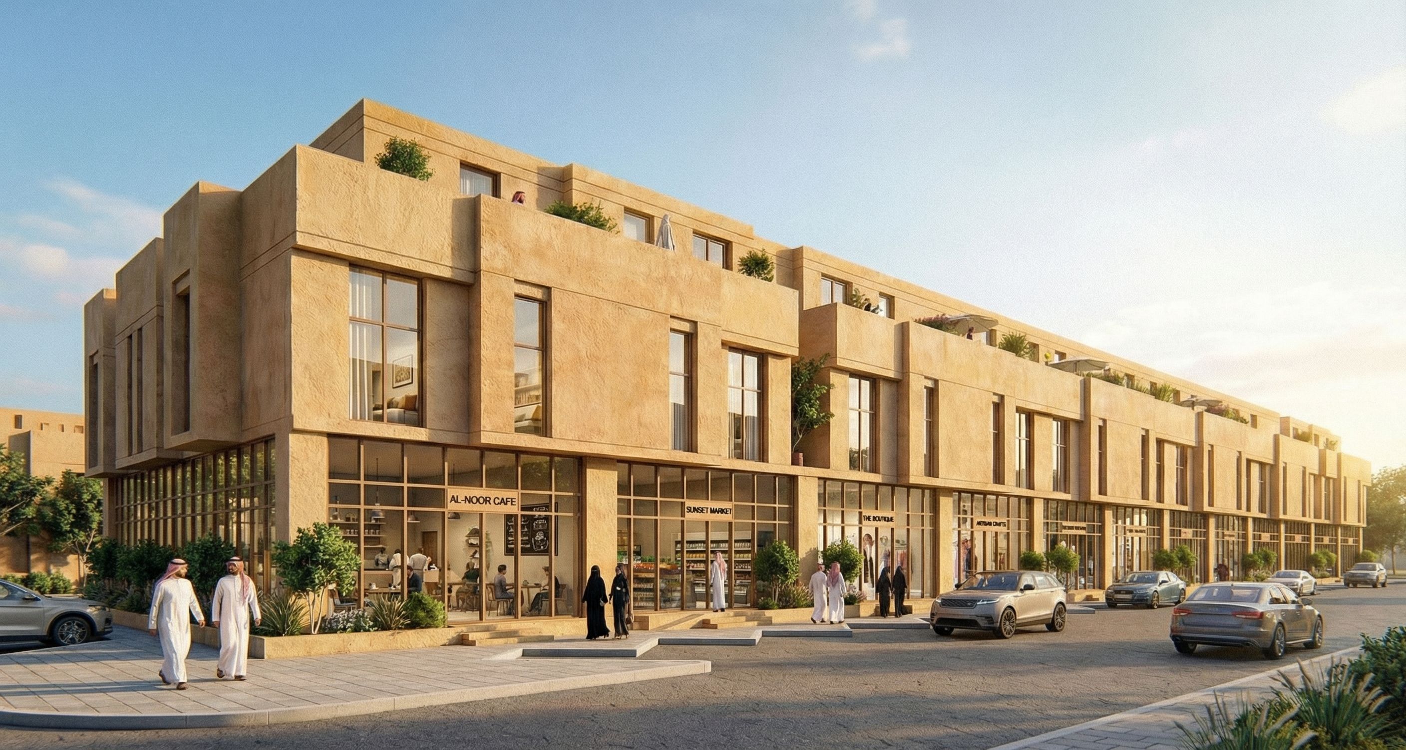Add shops interior details cafe extra with signs names.. & appartments in first floor furniture, add saudi families & cars, keep exact camera angle