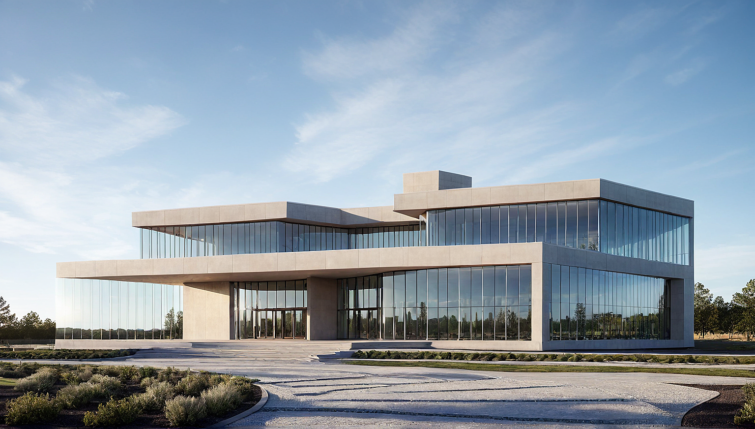 Prompt"A modern multi-story building with a contemporary architectural design, featuring staggered geometric sections and a full glass façade with no solid walls and slab and beam in beige color. The structure is made entirely of sleek, reflective glass panels, creating a futuristic and elegant aesthetic. Large floor-to-ceiling windows allow natural light to flood the interior. The building has a covered entrance supported by sleek columns, surrounded by landscape with pathway lighting. The setting is captured during day, with soft ambient lighting enhancing the transparency and sophistication of the structure