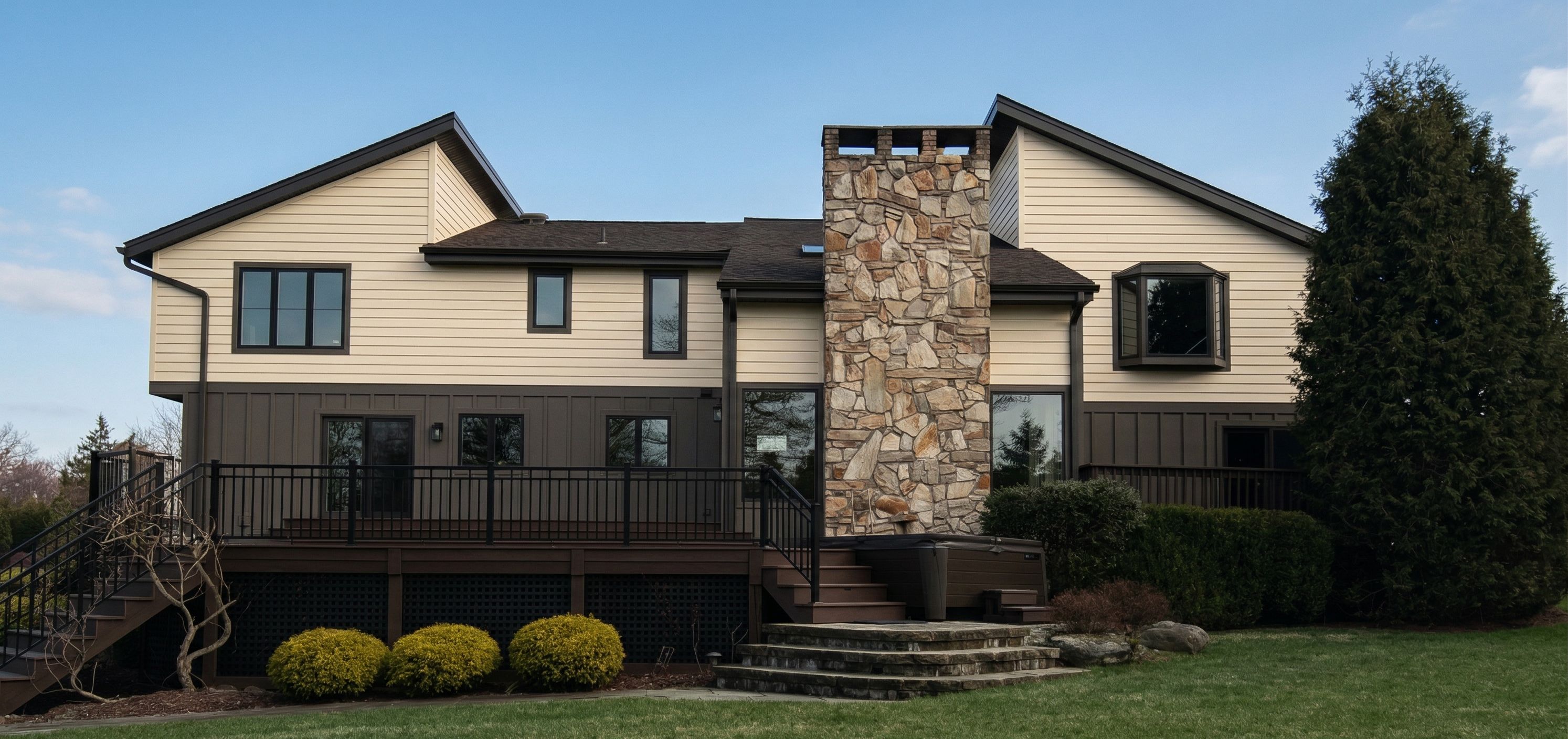 PromptEdit this image of the rear of a two story home to match a modern transitional exterior renovation consistent with the front elevation shown in reference image 1. Replace all existing siding with a two tone material palette. Apply a warm cream colored horizontal clapboard siding to all upper portions of the home, including both upper gables and second floor walls. The siding should be smooth, refined, and evenly spaced with a high end residential finish. Apply a dark charcoal or deep taupe board and batten siding to all lower portions of the home, including the ground level walls beneath the deck and surrounding the lower structure. The board and batten should have evenly spaced vertical battens with subtle shadowing for realism. Maintain and enhance the existing stone chimney as a central vertical feature, ensuring it remains the only natural textured material. Update all windows to black framed modern windows with minimal trim. Paint all trim, fascia, and roof edges a dark charcoal or black to create clean, sharp architectural lines. Simplify all trim details and remove any decorative elements for a clean, modern appearance. Keep the existing deck structure but refine its appearance to coordinate with the new palette, using darker tones that complement the board and batten siding. Preserve the original structure, proportions, and rooflines exactly as they are. Ensure the rendering is photorealistic with accurate lighting, material textures, and shadows., keep exact camera angle