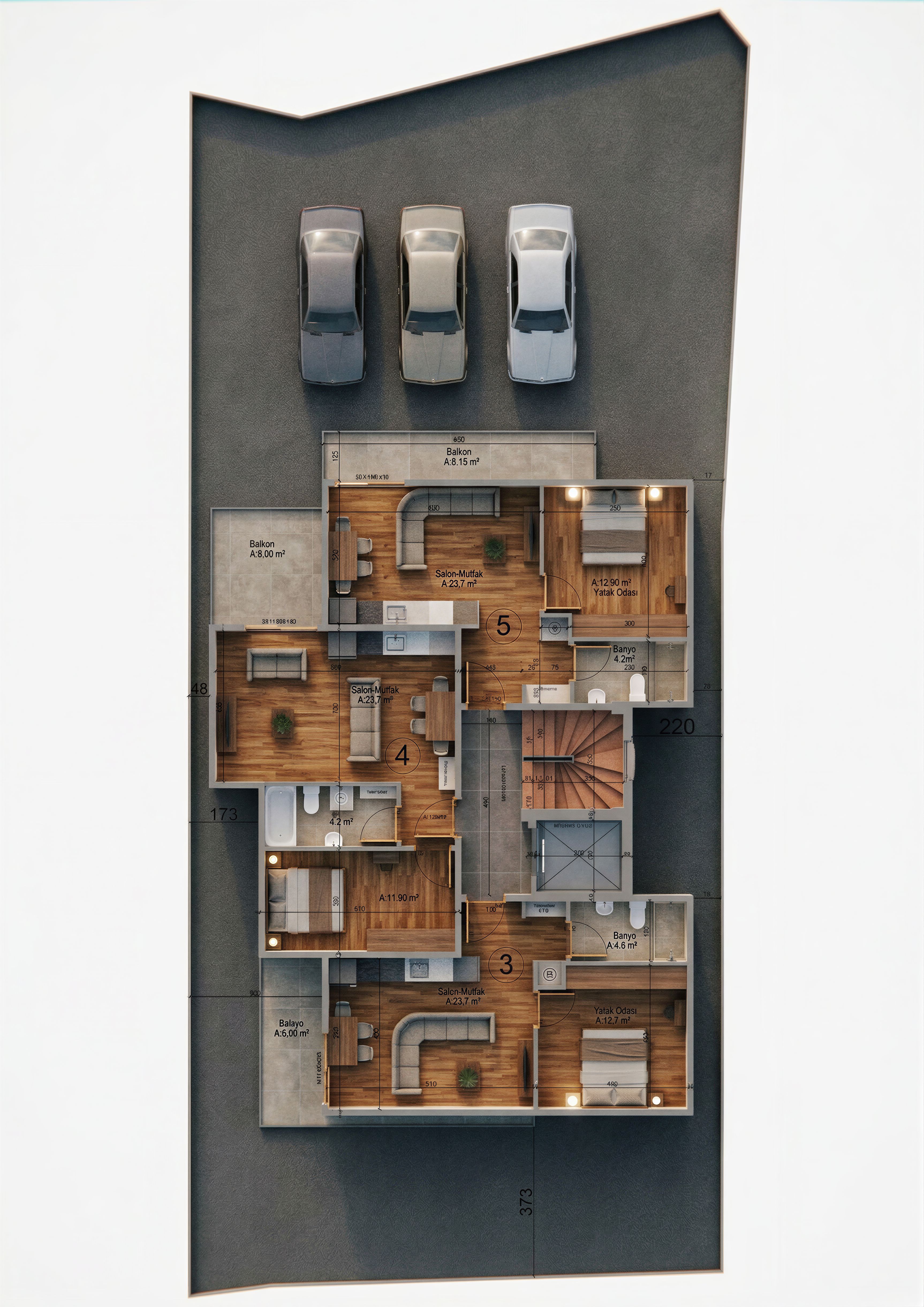 EnhancedPromptTHIS IS A TWO-DIMENSIONAL ARCHITECTURAL PLAN BUILT ON A PLOT OF LAND, CONSISTING OF 3 SEPARATE APARTMENTS, A FLOOR HALL, AND A STAIRCASE. COULD YOU PAINT IT ACCORDING TO THE FLOORING OF THE ROOMS? (BATHROOM: CERAMIC, LIVING ROOM-KITCHEN: WOODEN PARQUET, BEDROOM: PARQUET, FLOOR HALL AND STAIRCASE: CERAMIC TILES IN A DIFFERENT COLOR THAN THE BATHROOM, AND THE ELEVATOR COULD BE PAINT GRAY.), keep exact camera angle
