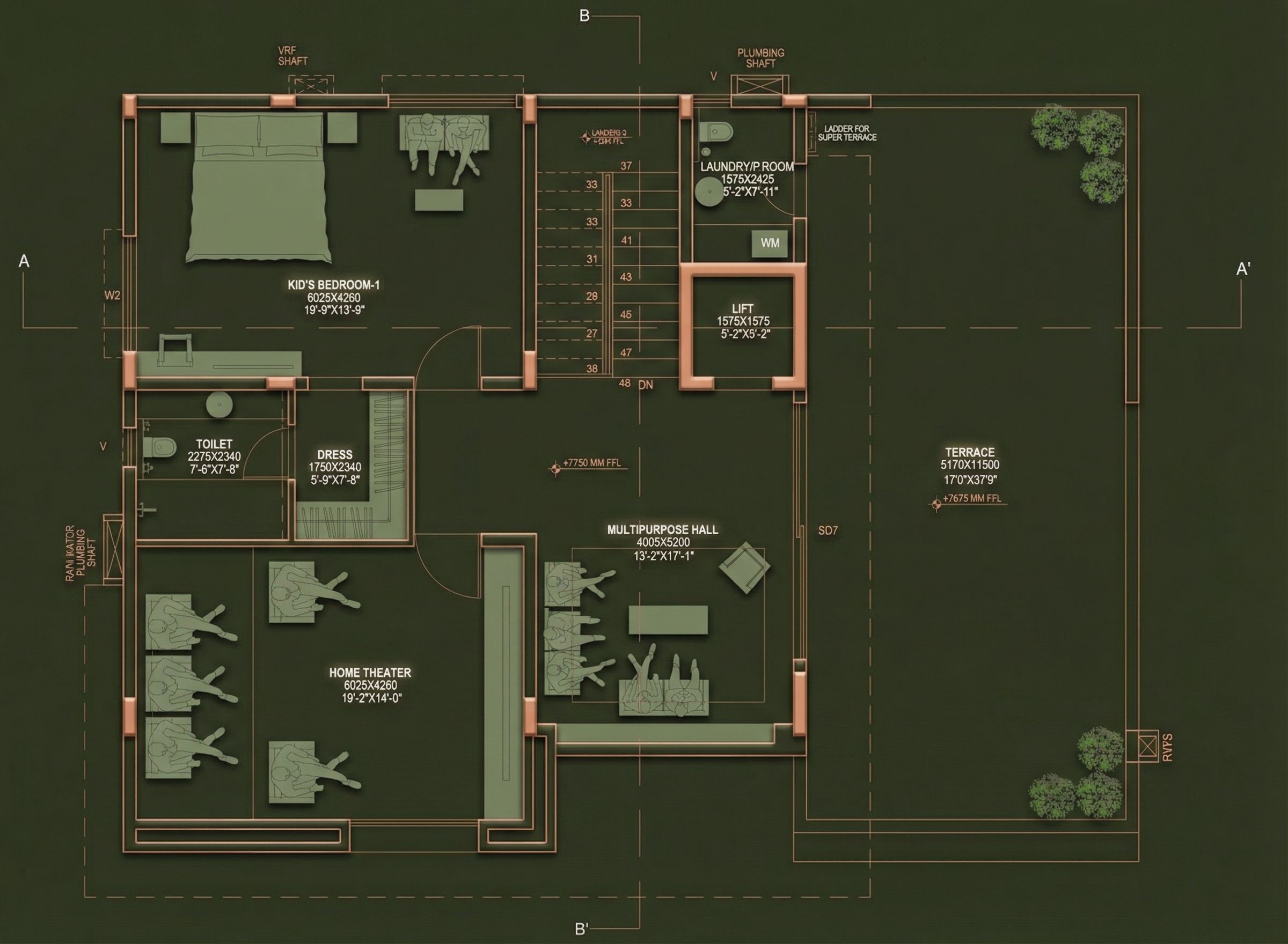 Prompt{ "prompt": "Create premium 2D marketing floor plan using uploaded drawing reference. Dark olive green background. Copper outline walls with soft bevel depth. Furniture in muted green tone. Add architectural text labels similar to real estate brochures. Main room titles bold uppercase white font size 38pt. Secondary room labels regular uppercase font size 22pt. Place text centered inside rooms. Add subtle glow shadow under text. Maintain clean spacing. Flat top-down orthographic view. Ultra crisp vector edges. HDR lighting. No watermark, no brand logos. Print ready output.", "size": "4096x4096", "n": 1 } , keep exact camera angle