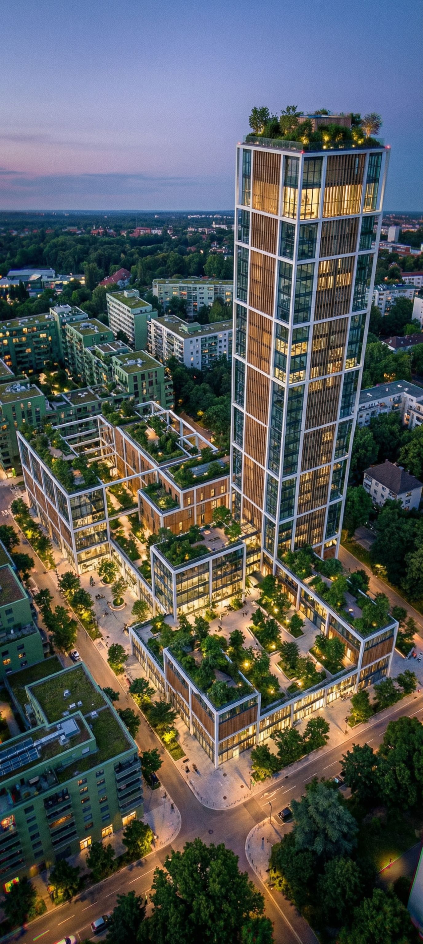Create a photorealistic neighborhood, in a modern, green style, with many rooftop gardens and green public spaces. Create buildings with this precise geometry. Use extensive glass, wood cladding, and white steel structures., keep exact camera angle