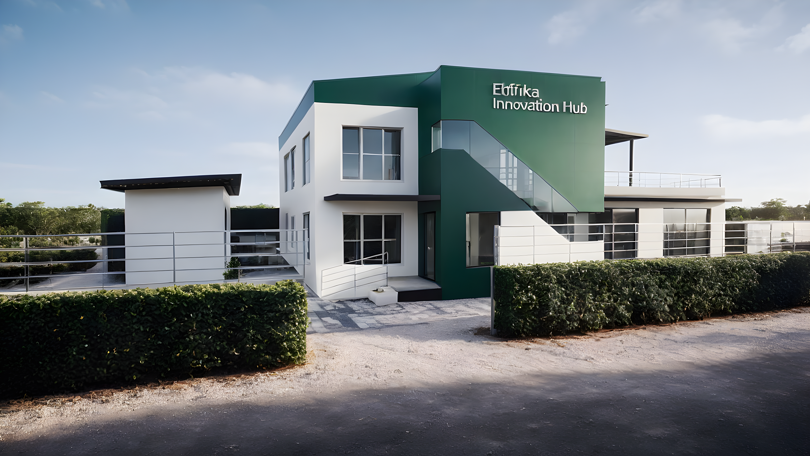 PromptMaintain existing wall colours, frontal green wall to be aluminium composite panels. Include interior training room furniture. Interior warm white lights, exterior wall lamps and lights. Few nice cars. Modern sophisticated look. Add trees to rear and sides of property. Add few masquerade trees. Maintain all colors but make them better. Keep the texts as it is, the text remains as Edfrika Innovation Hub. frnt road to be natural sand.