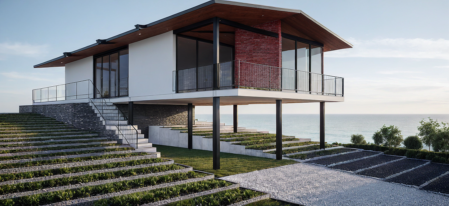 modern house facade, wood ceiling, black metallic structure, balcony landscape view, windows surrounded the corner, and left wall neat white and right wall red bricks, grey floor. garage downstairs. base is made with stone