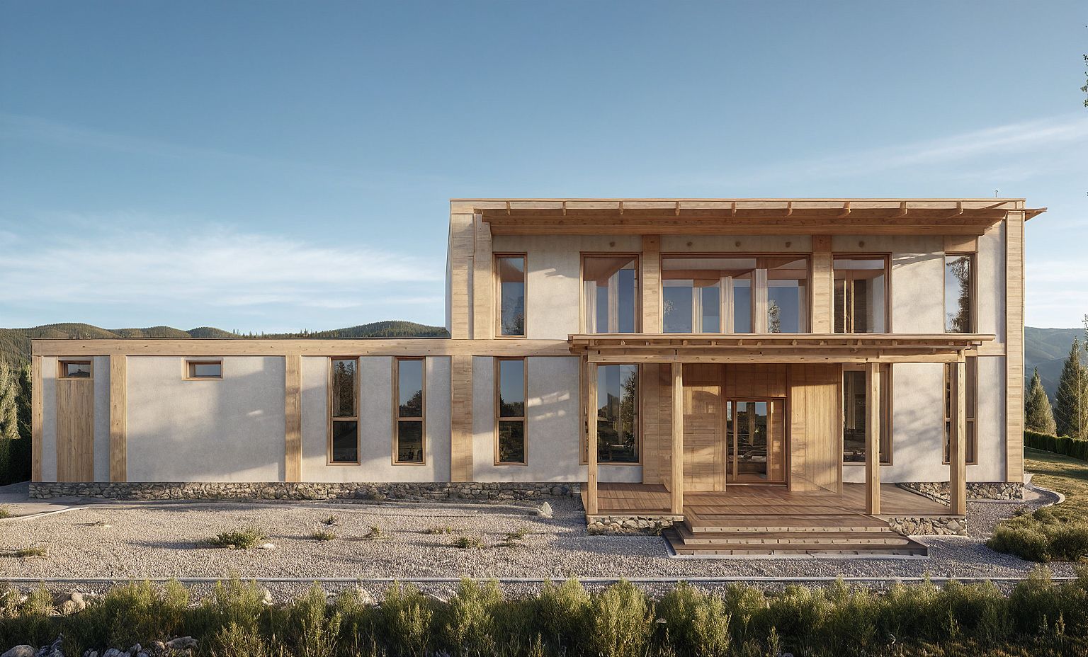 Promptsoft sun on a clear day with a facade consisting of wood and beige plaster walls in a mountain backdrop surrounded by poplar, willow and juniper trees
