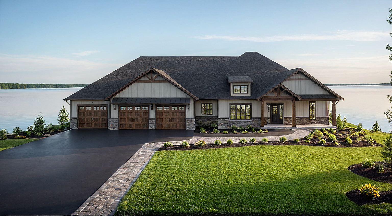 Promptadd greenery, landscaping, grass front yard and tress, flower beds, paved driveway to the left as shown, add a lake background off in the distance, only have garage door windows at the top, leave the covered porch alone far right
