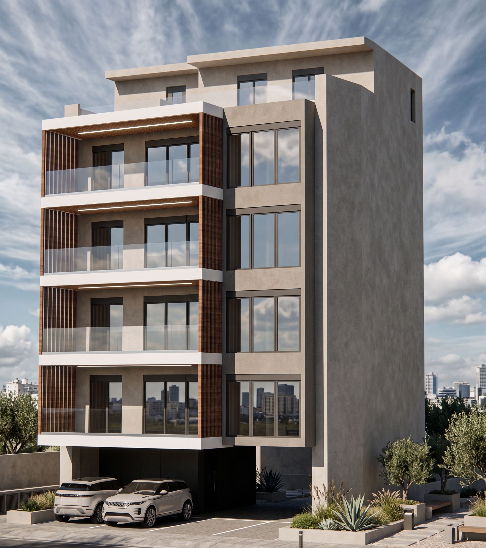 PromptBuilding in grey beige pal tone with white balconies with wooden ceiling in balconies and grammical white color light in balconies.More realistic. Remove the green area in front of the building, keep exact camera angle
