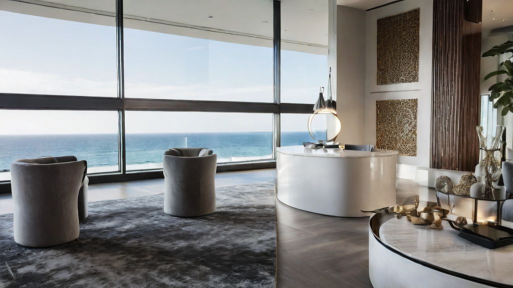 Photo of a modern interior living space featuring a cozy seating area with a grey accent chair, surrounded by contemporary furniture. Emphasize the smooth textures of the grey and white walls and flooring, the interplay of light and shadows, and a large expanse of glass revealing a terrace that extends outward, beyond which an ocean view meets the horizon alongside a city skyline. Natural lighting floods the room, highlighting the intricate patterns of the area rug. Capture from a low angle, utilizing a wide lens to create a spacious, inviting atmosphere, framing the furniture and artistic décor elements against the backdrop of urban high-rises and the serene ocean beyond.
