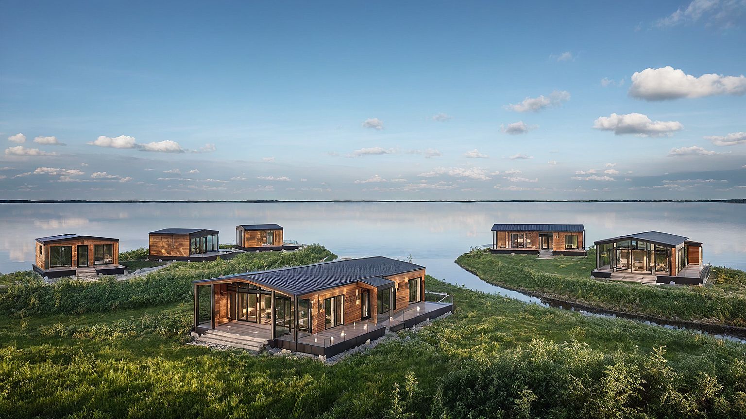Photo of modern residential barn houses located on a grassy landscape next to a calm stream. Focus on natural wood and smooth metal materials, as well as large glass windows that reflect the surrounding environment. Emphasize modern design elements such as overhanging roofs and spacious decks. The image was taken from a low angle to demonstrate depth and layout, using a wide-angle lens to get an extensive view that includes nearby cottages and lush greenery in the foreground. in background surrounded by a tall coniferous forest with a lake.